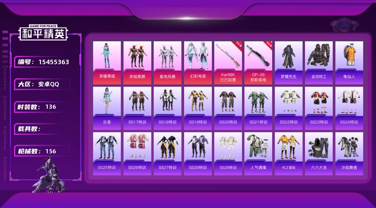 [15455363]【1688】安卓 手Q-4粉装-2特效枪-0载具-0粉色飞行器-43308热力值-7王牌印记-136套装-156枪皮