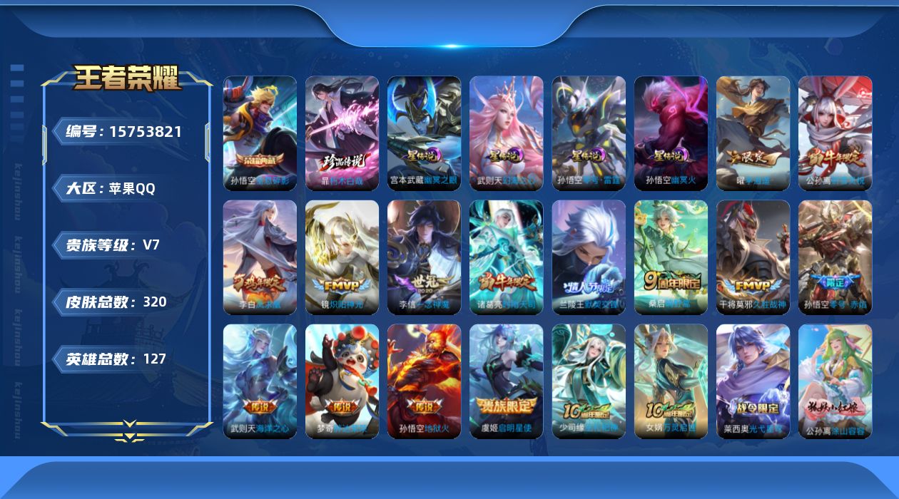[15753821]【特价出售/店主推荐/3省标/5市标/37段打野】:苹果Q-V8-至尊星耀III段位-127英雄-320皮肤-1典藏皮肤-1典藏英雄-1珍品传说-4星元-14传说-102史诗