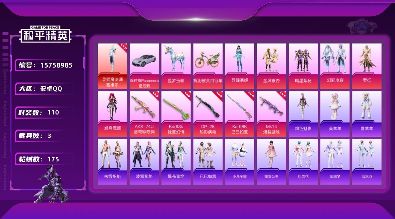 [15758985]安卓 手Q-1神装-6粉装-5特效枪-3载具-4粉色飞行器-58346热力值-6王牌印记-110套装-175枪皮 【红色神装等级】:灵猫魔法师-塞维尔(二级) 【红色角色神装】:灵猫魔法师-塞维尔 【粉色套装】:粉装-金风银杏,粉装-暗星紫秘,粉装-幻彩电音,角色-罗征,角色-绯穹魔姬,角色-异瞳寒姬 【粉色枪皮等级】:AKS-74U-星穹咏叹调(六级),Kar98K-绿意幻情(六级),Kar98K-巳巳如意(五级),Mk14-爆裂游戏(五级),DP-28-豹影疾电(五级) 【粉色载具】:保时捷Panamera(星辰紫),星梦玉骢,辉羽雀灵自行车 【粉色枪皮】:AKS-74U-星穹咏叹调,Kar98K-绿意幻情,Kar98K-巳巳如意,Mk14-爆裂游戏,DP-28-豹影疾电 【粉色飞行器】:繁龙极客飞行器,时光之誓飞行器,灵猫魔法师飞行器,灵珠游龙飞行器 【粉色降落伞】:春暖花开降落伞,星之彼岸降落伞,葫芦兄弟降落伞,焰龙焚天降落伞,暗夜玫瑰降落伞,蓝莓炮弹降落伞,绿意幻情降落伞,橘柚倾心降落伞,猪猪侠降落伞,智耀战神降落伞,辉羽雀灵降落伞,幻彩电音降落伞,双重狂想降落伞,冷漠罗丽降落伞,灵猫魔法师降落伞,喜羊羊与灰太狼降落伞,魔童闹海 敖丙降落伞,异瞳寒姬降落伞,炫彩糖果降落伞 【稀有套装】:套装-巳巳如意,套装-小鸟芋圆,角色-临安公主,套装-粉恋花,套装-紫幽梦,套装-蓝冰羽,套装-星影赞美诗,套装-彩虹兔,套装-云朵鹅,套装-雪绒豹,套装-诡诞巡游,角色-时希公主,角色-灵公主,角色-乐音,套装-朱霞炽焰,套装-凌霄紫焰,套装-擎苍青焰,玩偶服-美羊羊,玩偶服-喜羊羊,角色-绯色魅影 【稀有枪皮】:AKM-夜灯,AKM-星之彼岸,AKM-灼热熔岩,AKM-破晓战魂,AKM-虎虎生威,AKM-龙的传人,M16A4-幻世战舞者,M16A4-红色方程式,M16A4-蓝色火焰,M16A4-最终圣卫者,SCAR-L-炫彩节奏,SCAR-L-玉兔迎春,SCAR-L-红色方程式,SCAR-L-冷漠罗丽,M416-红色方程式,M416-蓝色火焰,GROZA-异彩先驱,GROZA-蓝莓炮弹,AUG-耀粉歌者,QBZ-彩虹符号,QBZ-飞驰魅影,M762-天降萌叽,M762-牛气冲天,M762-瑞龙福将,M762-风花雪月,M762-云朵鹅,G36C-星穹咏叹调,AC-VA