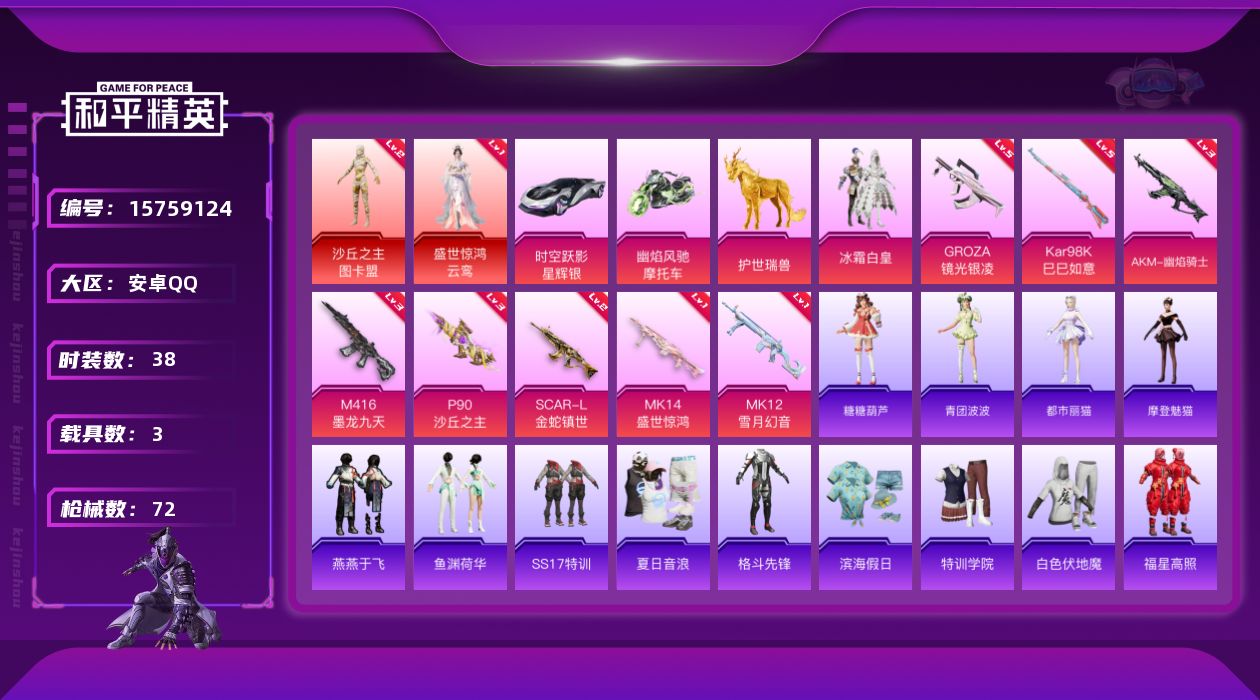 [15759124]安卓 手Q-2神装-1粉装-8特效枪-3载具-9粉色飞行器-30986热力值-1王牌印记-38套装-72枪皮