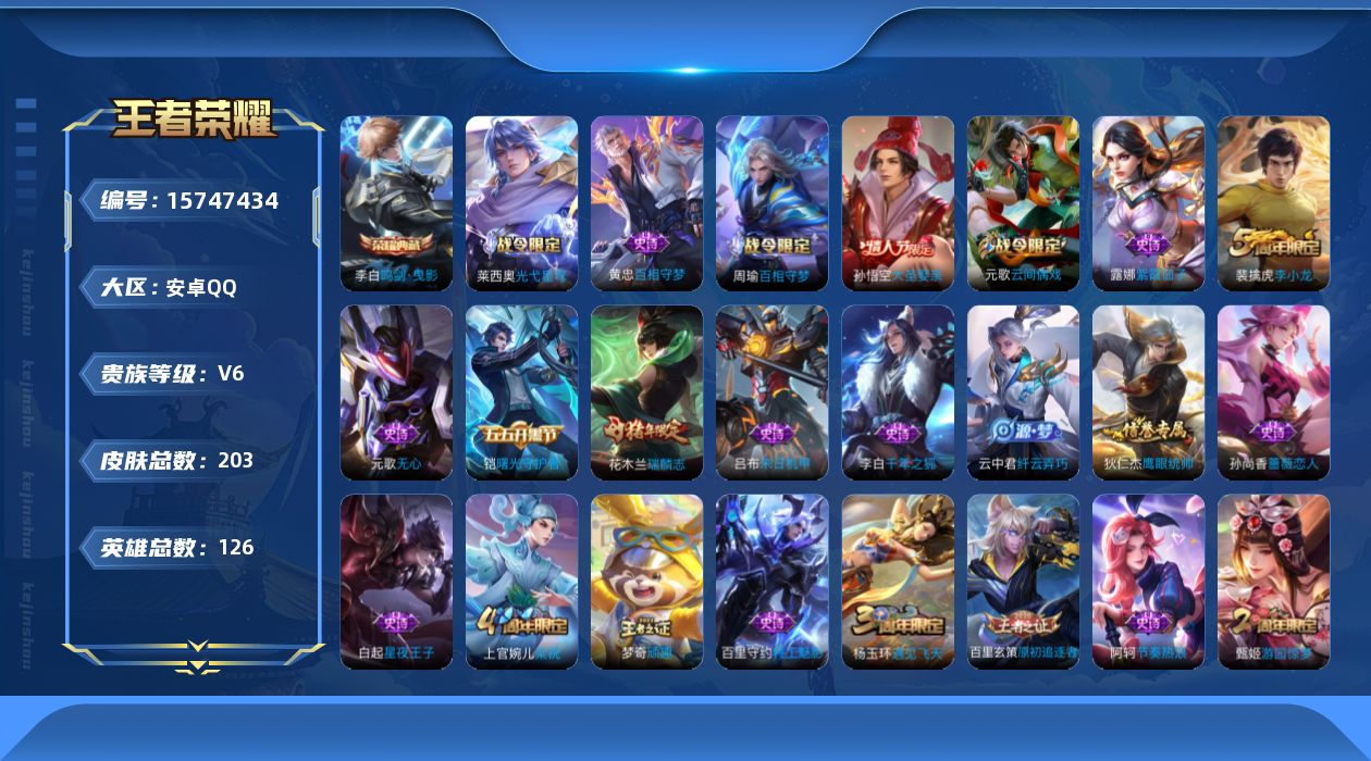 - [15156240]可二次【店主推荐捡漏号!可直接换绑】安卓Q-V6-最强王者段位-128英雄-349皮肤-2典藏皮肤-1典藏英雄-1星传说-36传说-105史诗 【英雄全皮】:猪八戒全皮 【荣耀典藏】:武则天英雄,孙悟空全息碎影,芈月大秦宣太后 【传说皮肤】:后羿神树通天,桑启鸣野蒿,孙尚香异界灵契,貂蝉遇见胡旋,赵云淬星耀世,王昭君乞巧织情,西施游龙清影,曜李逍遥 ,周瑜音你心动,小乔音你心动,李元芳飞鸢探春,兰陵王默契交锋,公孙离祈雪灵祝,诸葛亮时雨天司,铠绛天战甲,镜炽阳神光,孙悟空零号赤焰,曜云鹰飞将,李信一念神魔,刘备时之恋人,伽罗太华,貂蝉猫影幻舞,张良黄金白羊座,干将莫邪久胜战神,虞姬云霓雀翎,达摩黄金狮子座,百里玄策白虎志,花木兰冠军飞将,梦奇胖达荣荣,后羿黄金射手座,貂蝉仲夏夜之梦,孙尚香末日机甲,宫本武藏地狱之眼,孙悟空地狱火,武则天海洋之心,狄仁杰超时空战士 【限定皮肤】:白起狰,狄仁杰阴阳师,虞姬凯尔特女王,赵云皇家上将,赵云引擎之心,墨子神迹守卫,嬴政白昼王子,孙尚香蔷薇恋人,孙尚香异界灵契,鲁班七号乒乒小将,高渐离死亡摇滚,钟无艳王者之锤,孙膑妖精王,孙膑天狼运算者,扁鹊炼金王,芈月重明,芈月白晶晶,吕布猎兽之王,吕布御风骁将,周瑜赤莲之焰,元歌云间偶戏,元歌无心,夏侯惇朔风刀,甄姬游园惊梦,曹操烛龙,典韦穷奇,马可波罗逐梦之星,马可波罗暗影游猎,狄仁杰魔术师,狄仁杰万华元夜,达摩星际陆战队,项羽海滩派对,项羽霸王别姬,老夫子醍醐杖,老夫子航海奇遇记,关羽冰锋战神,貂蝉遇见胡旋,程咬金演武夺筹,露娜一生所爱,刘邦夺宝奇兵,韩信逐梦之影,兰陵王默契交锋,兰陵王驯魔猎人,花木兰默契交锋,亚瑟潮玩骑士王,孙悟空大圣娶亲,孙悟空零号赤焰,孙悟空孙行者,牛魔奔雷神使,张飞虎魄,李元芳云中旅人,虞姬霸王别姬,钟馗驱傩正仪,杨玉环遇见飞天,干将莫邪冰霜恋舞曲,雅典娜单词大作战,蔡文姬奇迹圣诞,太乙真人饕餮,太乙真人华丽摇滚,东皇太一逐梦之光,鬼谷子原初探秘者,诸葛亮时雨天司,大乔白鹤梁神女,铠青龙志,百里玄策白虎志,百里玄策原初追逐者,弈星混沌棋,公孙离蜜橘之夏,公孙离祈雪灵祝,明世隐疑决卦,裴擒虎李小龙,狂铁御狮,米莱狄御霄,米莱狄胡桃异想国,伽罗太华,伽罗天狼溯光者,盾山御銮,猪八戒西部大镖客,猪八戒猪悟能,上官婉儿梁祝,嫦娥拒霜思,曜李逍遥 ,蒙犽狂想玩偶喵,桑