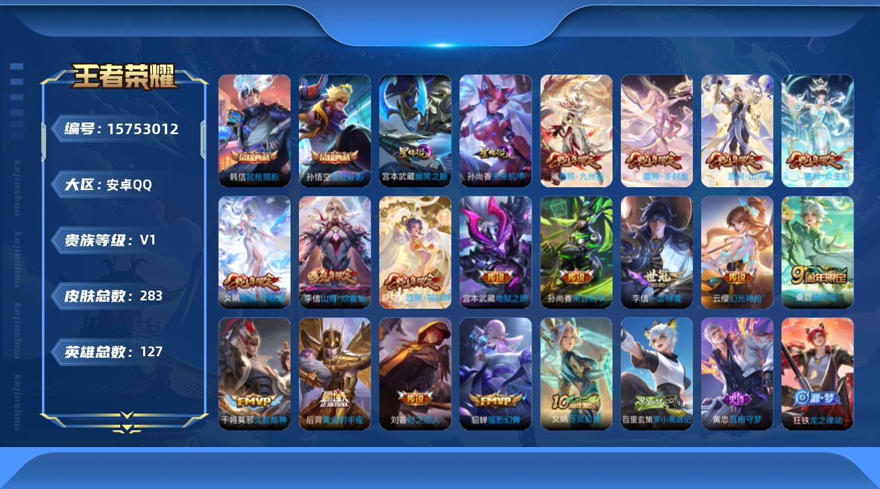 [15753012]【店主推荐捡漏号!可直接换绑】安卓Q-V1-最强王者段位-127英雄-283皮肤-2典藏皮肤-17传说-83史诗-2星元