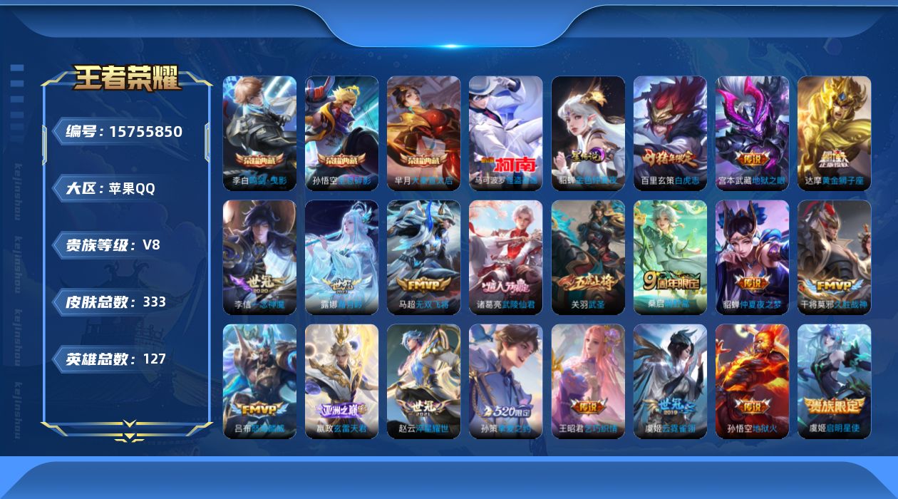 - [13868741]苹果Q-V3-297皮肤-1典藏-23传说-84史诗 【英雄全皮】:猪八戒全皮,影全皮 【荣耀典藏】:李白鸣剑曳影 【传说皮肤】:马超无双飞将,赵云淬星耀世,曜李逍遥 ,诸葛亮时雨天司,镜炽阳神光,虞姬启明星使,孙悟空零号赤焰,关羽武圣,曜云鹰飞将,李信一念神魔,张良黄金白羊座,干将莫邪久胜战神,虞姬云霓雀翎,达摩黄金狮子座,百里玄策白虎志,花木兰冠军飞将,后羿黄金射手座,貂蝉仲夏夜之梦,李白凤求凰,孙尚香末日机甲,宫本武藏地狱之眼,孙悟空地狱火,狄仁杰超时空战士 【限定皮肤】:白起狰,姜子牙天穹之誓,狄仁杰阴阳师,小乔纯白花嫁,虞姬凯尔特女王,赵云皇家上将,赵云龙胆,墨子神迹守卫,嬴政优雅恋人,嬴政白昼王子,庄周蜃楼王,庄周高山流水,高渐离死亡摇滚,钟无艳王者之锤,孙膑妖精王,孙膑天狼运算者,扁鹊炼金王,芈月重明,芈月白晶晶,芈月幻夜卜梦,吕布猎兽之王,吕布御风骁将,周瑜真爱至上,元歌云间偶戏,夏侯惇朔风刀,甄姬游园惊梦,曹操烛龙,典韦穷奇,马可波罗暗影游猎,狄仁杰魔术师,狄仁杰万华元夜,达摩星际陆战队,达摩沙漠行僧,项羽海滩派对,老夫子圣诞老人,老夫子醍醐杖,老夫子航海奇遇记,关羽冰锋战神,关羽武圣,程咬金演武夺筹,韩信逐梦之影,兰陵王金庭之子,花木兰青春决赛季,花木兰默契交锋,亚瑟狮心王,亚瑟潮玩骑士王,孙悟空大圣娶亲,孙悟空零号赤焰,孙悟空孙行者,牛魔御旌,后羿圣弓游侠,李元芳云中旅人,虞姬启明星使,钟馗驱傩正仪,杨玉环寅虎心曲,干将莫邪冰霜恋舞曲,干将莫邪真爱魔法,雅典娜单词大作战,雅典娜黎明之约,蔡文姬繁星吟游,太乙真人饕餮,太乙真人华丽摇滚,鬼谷子原初探秘者,诸葛亮时雨天司,黄忠火炮绅士,铠青龙志,苏烈玄武志,苏烈千军破阵,百里玄策白虎志,百里玄策原初追逐者,百里守约朱雀志,弈星混沌棋,公孙离蜜橘之夏,明世隐疑决卦,裴擒虎李小龙,狂铁御狮,米莱狄御霄,米莱狄胡桃异想国,云中君纤云弄巧,伽罗天狼溯光者,盾山御銮,猪八戒西部大镖客,猪八戒猪悟能,上官婉儿天狼绘梦者,曜李逍遥 ,蒙犽狂想玩偶喵,鲁班大师探海日志,桑启海盐诗旅,张良古海寻踪,鬼谷子天穹祈灯,刘邦剑破天穹,程咬金群星魔术团,刘备异域游侠,周瑜熔金海岸 【年限皮肤】:百里玄策白虎志,百里守约朱雀志,铠青龙志,苏烈玄武志,杨玉环寅虎心曲,李白凤求凰,吕布御风骁将,诸葛亮时雨天司,马超神威,关羽武圣