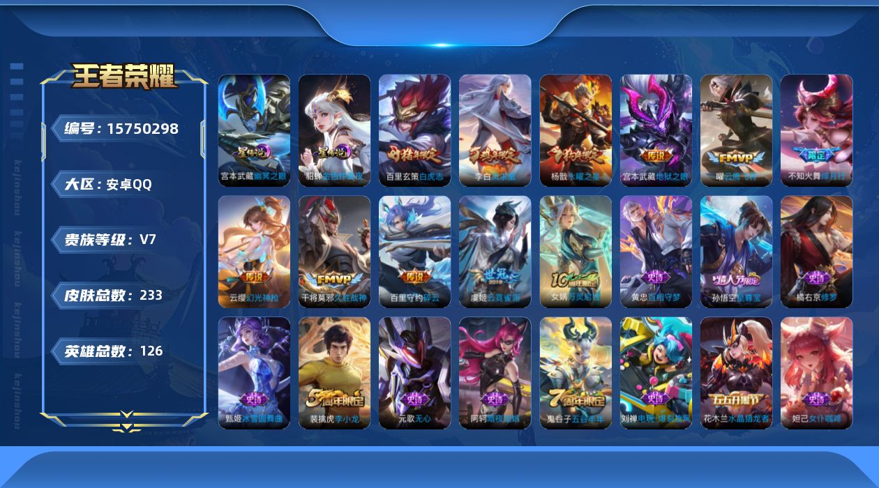 [15750298]可二次【特价出售/店主推荐】发育路34段、中路33段,安卓Q-V7-最强王者段位-126英雄-233皮肤-3星传说-11传说-49史诗