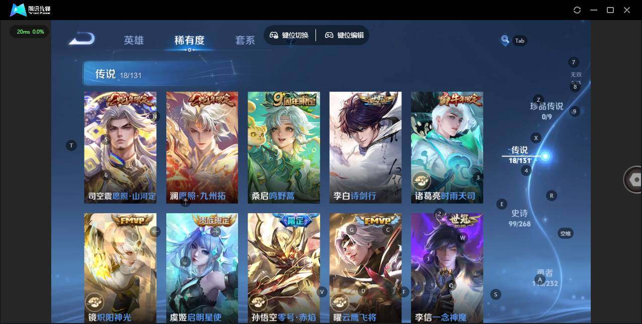 【传说皮肤】:司空震愿照山河定,澜愿照九州拓,桑启鸣野蒿,李白诗剑行,诸葛亮时雨天司,镜炽阳神光,虞姬启明星使,孙悟空零号赤焰,曜云鹰飞将,李信一念神魔,干将莫邪久胜战神,达摩黄金狮子座,百里玄策白虎志,花木兰冠军飞将,貂蝉仲夏夜之梦,李白凤求凰,孙尚香末日机甲,宫本武藏地狱之眼