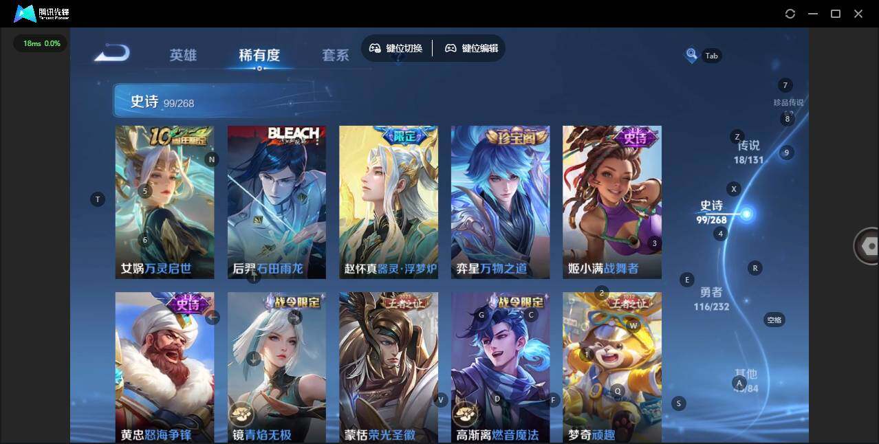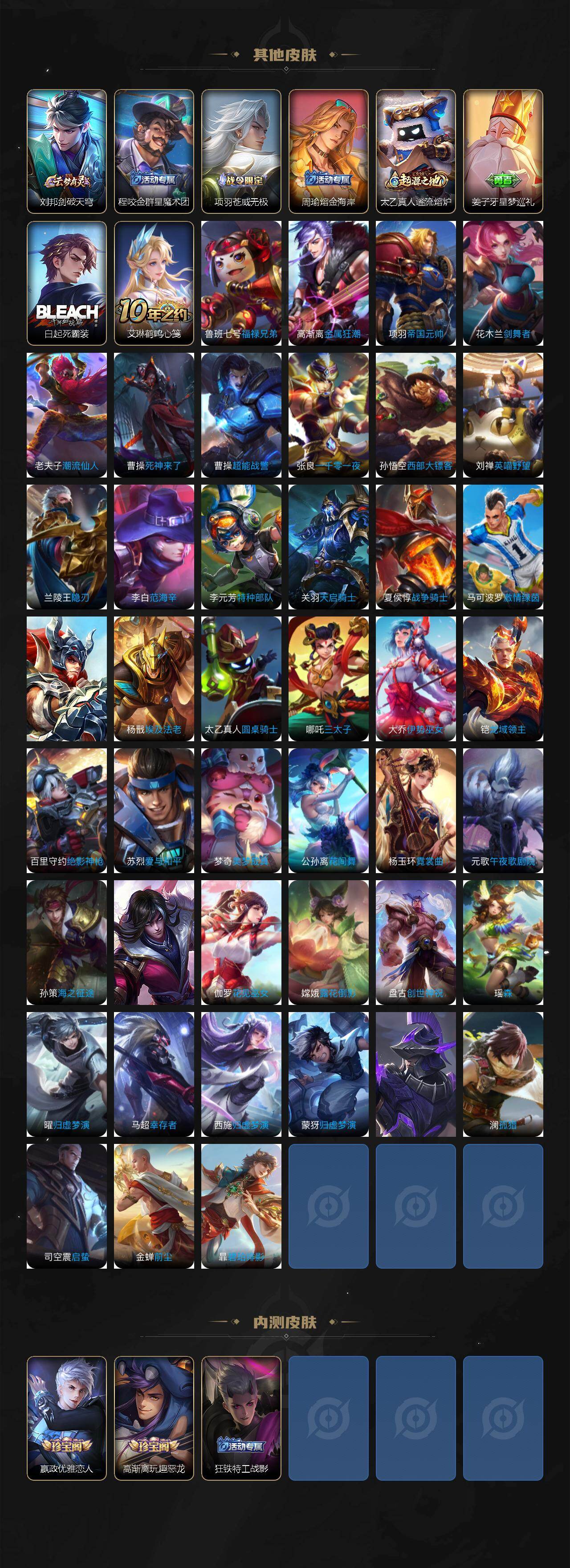关羽冰锋战神,裴擒虎李小龙,上官婉儿梁祝,牛魔奔雷神使,诸葛亮时雨天司,黄忠烈魂,张飞虎魄,马超神威,后羿辉光之辰,韩信飞衡,孙膑天狼运算者,上官婉儿天狼绘梦者,伽罗天狼溯光者,东皇太一逐梦之光,百里玄策白虎志,孙悟空大圣娶亲,露娜一生所爱,花木兰默契交锋,孙悟空至尊宝,干将莫邪冰霜恋舞曲,花木兰青春决赛季,妲己时之彼端,公孙离蜜橘之夏,芈月白晶晶,猪八戒猪悟能,李白诗剑行,桑启鸣野蒿,澜愿照·九州拓,司空震愿照·山河定
