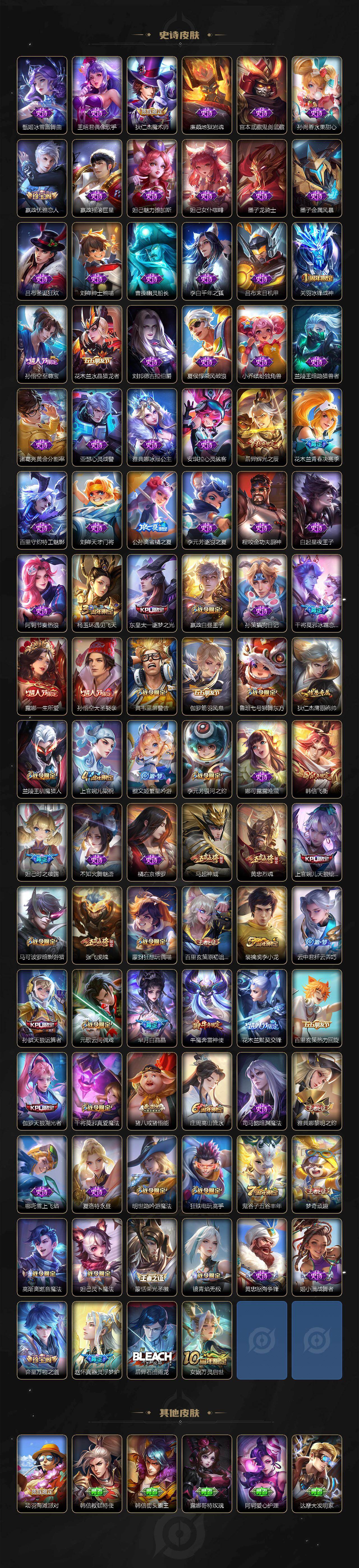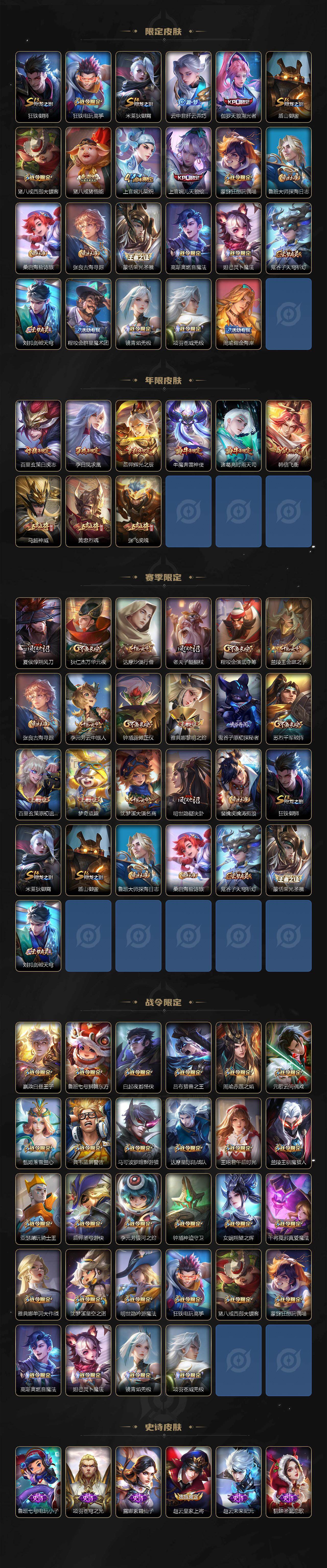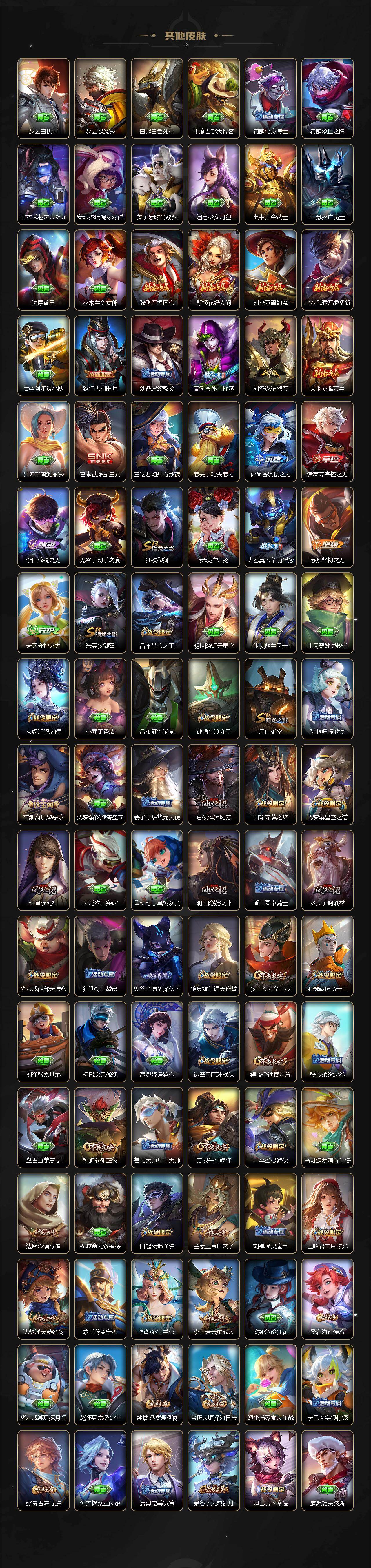 【限定皮肤】:狄仁杰阴阳师,赵云皇家上将,妲己时之彼端,嬴政优雅恋人,嬴政白昼王子,鲁班七号狮舞东方,庄周高山流水,高渐离死亡摇滚,高渐离玩趣恶龙,孙膑天狼运算者,白起夜都怪侠,芈月白晶晶,吕布猎兽之王,周瑜赤莲之焰,元歌云间偶戏,夏侯惇朔风刀,甄姬落雪兰心,典韦蓝屏警告,马可波罗暗影游猎,狄仁杰魔术师,狄仁杰万华元夜,达摩星际陆战队,达摩沙漠行僧,项羽海滩派对,老夫子醍醐杖,关羽冰锋战神,程咬金演武夺筹,露娜一生所爱,韩信飞衡,王昭君午后时光,兰陵王驯魔猎人,兰陵王金庭之子,花木兰青春决赛季,花木兰默契交锋,亚瑟潮玩骑士王,孙悟空至尊宝,孙悟空大圣娶亲,孙悟空零号赤焰,牛魔奔雷神使,后羿辉光之辰,后羿圣弓游侠,张飞虎魄,李元芳银河之约,李元芳云中旅人,虞姬启明星使,钟馗神迹守卫,钟馗驱傩正仪,杨玉环遇见飞天,女娲朔望之晖,干将莫邪冰霜恋舞曲,干将莫邪真爱魔法,雅典娜单词大作战,雅典娜黎明之约,蔡文姬繁星吟游,太乙真人华丽摇滚,东皇太一逐梦之光,鬼谷子原初探秘者,鬼谷子五谷丰年,诸葛亮时雨天司,黄忠烈魂,苏烈千军破阵,百里玄策白虎志,百里玄策原初追逐者,弈星混沌棋,梦奇顽趣,公孙离蜜橘之夏,沈梦溪星空之诺,沈梦溪大漠名商,明世隐疑决卦,明世隐吟游魔法,裴擒虎李小龙,裴擒虎擒涛扼浪,狂铁御狮,狂铁电玩高手,米莱狄御霄,云中君纤云弄巧,伽罗天狼溯光者,盾山御銮,猪八戒西部大镖客,猪八戒猪悟能,上官婉儿梁祝,上官婉儿天狼绘梦者,蒙犽狂想玩偶喵,鲁班大师探海日志,桑启海盐诗旅,张良古海寻踪,蒙恬荣光圣徽,高渐离燃音魔法,妲己灵卜魔法,鬼谷子天穹祈灯,刘邦剑破天穹,程咬金群星魔术团,镜青焰无极,项羽苍威无极,周瑜熔金海岸