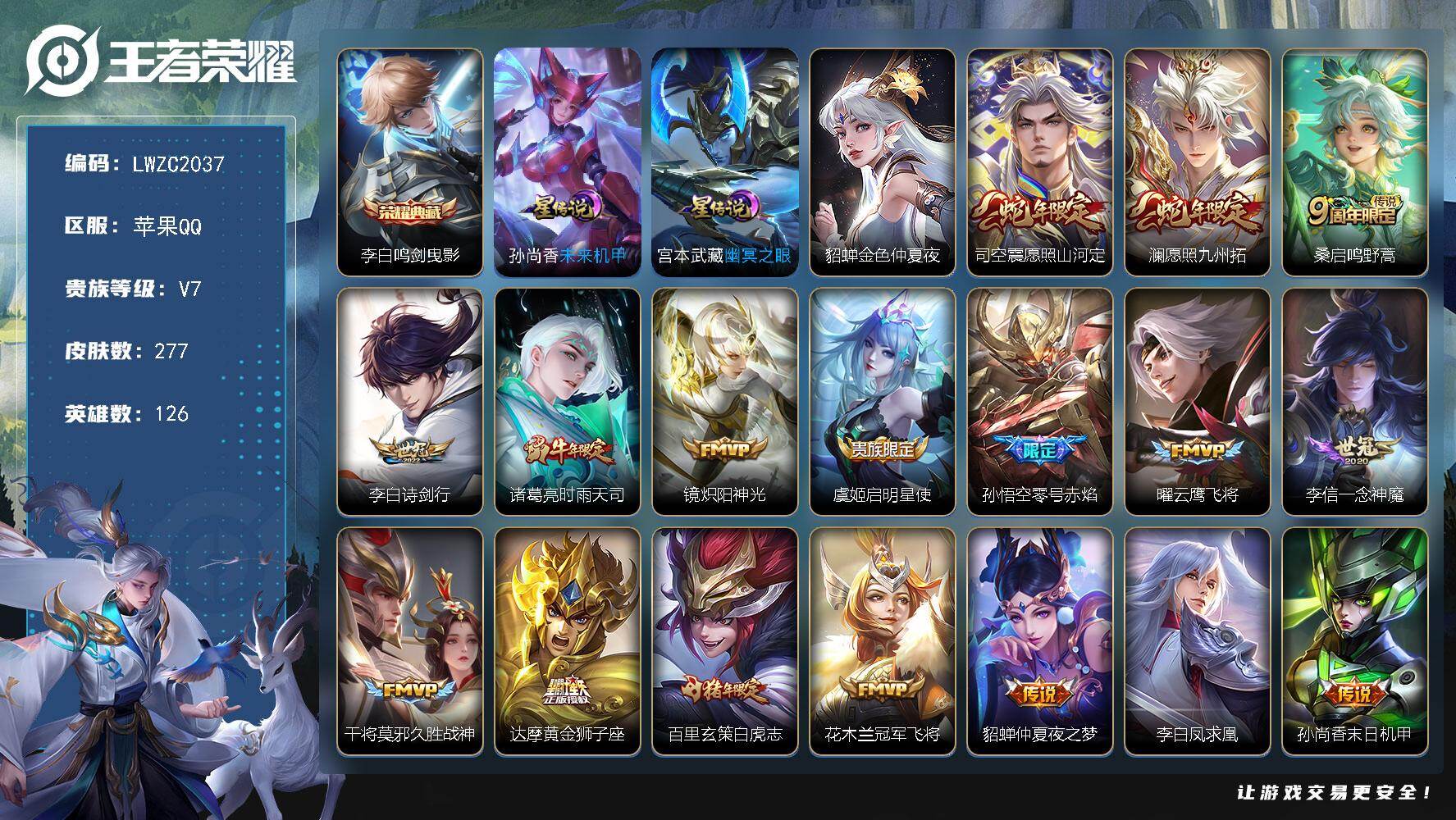 [15752451]【特价出售/店主推荐】打野31段,苹果Q-V7-永恒钻石II段位-126英雄-277皮肤-1典藏皮肤-3星传说-18传说-99史诗