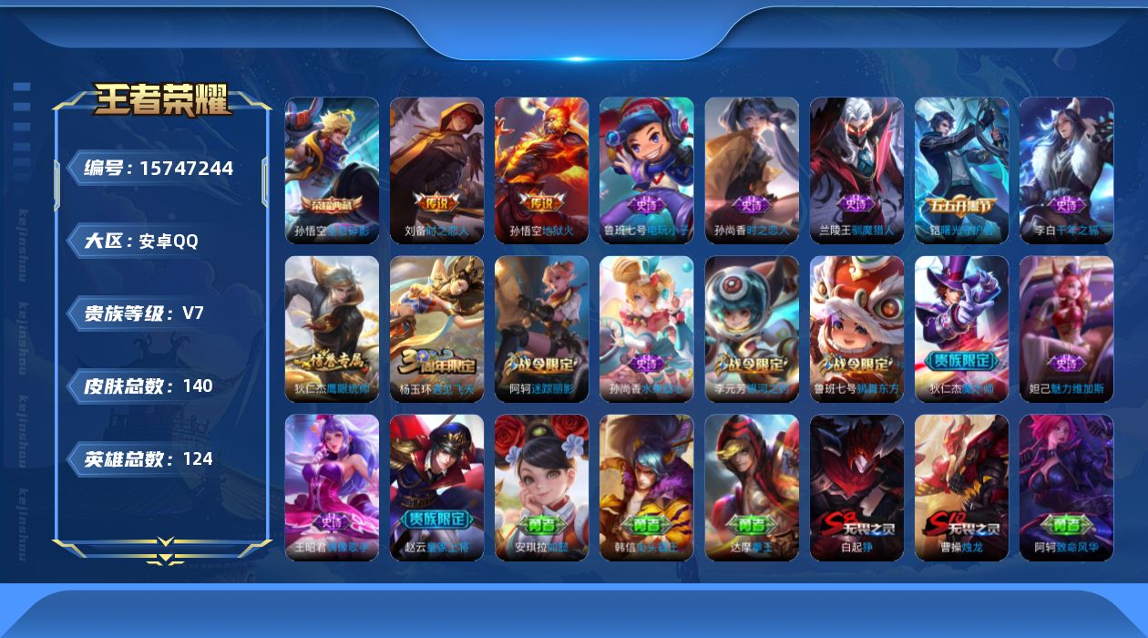 [15747244]账号来源干净 保证账号找回包赔 薄利多销 冲销量 平台保证金向商家安卓Q-V7-最强王者段位-124英雄-140皮肤-1典藏皮肤-2传说-15史诗【荣耀典藏】:孙悟空全息碎影【传说皮肤】:刘备时之恋人,孙悟空地狱火【限定皮肤】:白起狰,狄仁杰阴阳师,赵云皇家上将,鲁班七号狮舞东方,阿轲迷踪丽影,芈月重明,周瑜赤莲之焰,夏侯惇朔风刀,曹操烛龙,典韦穷奇,狄仁杰魔术师,狄仁杰万华元夜,项羽海滩派对,老夫子醍醐杖,程咬金演武夺筹,刘邦夺宝奇兵,兰陵王驯魔猎人,牛魔御旌,李元芳银河之约,李元芳云中旅人,钟馗神迹守卫,钟馗驱傩正仪,杨玉环遇见飞天,太乙真人饕餮,鬼谷子原初探秘者,弈星混沌棋,沈梦溪星空之诺,沈梦溪大漠名商,明世隐疑决卦,裴擒虎擒涛扼浪,狂铁御狮,米莱狄御霄,盾山御銮,鲁班大师探海日志,桑启海盐诗旅,沈梦溪龙舞盛年,刘邦剑破天穹【赛季限定】:白起狰,芈月重明,夏侯惇朔风刀,曹操烛龙,典韦穷奇,狄仁杰万华元夜,老夫子醍醐杖,程咬金演武夺筹,牛魔御旌,李元芳云中旅人,钟馗驱傩正仪,太乙真人饕餮,鬼谷子原初探秘者,弈星混沌棋,沈梦溪大漠名商,明世隐疑决卦,裴擒虎擒涛扼浪,狂铁御狮,米莱狄御霄,盾山御銮,鲁班大师探海日志,桑启海盐诗旅,刘邦剑破天穹【战令限定】:鲁班七号狮舞东方,阿轲迷踪丽影,周瑜赤莲之焰,刘邦夺宝奇兵,兰陵王驯魔猎人,李元芳银河之约,钟馗神迹守卫,沈梦溪星空之诺【史诗皮肤】:鲁班七号电玩小子,赵云皇家上将,王昭君偶像歌手,狄仁杰魔术师,孙尚香水果甜心,妲己魅力维加斯,李白千年之狐,铠曙光守护者,杨玉环遇见飞天,鲁班七号狮舞东方,狄仁杰鹰眼统帅,兰陵王驯魔猎人,李元芳银河之约,阿轲迷踪丽影,孙尚香时之恋人
