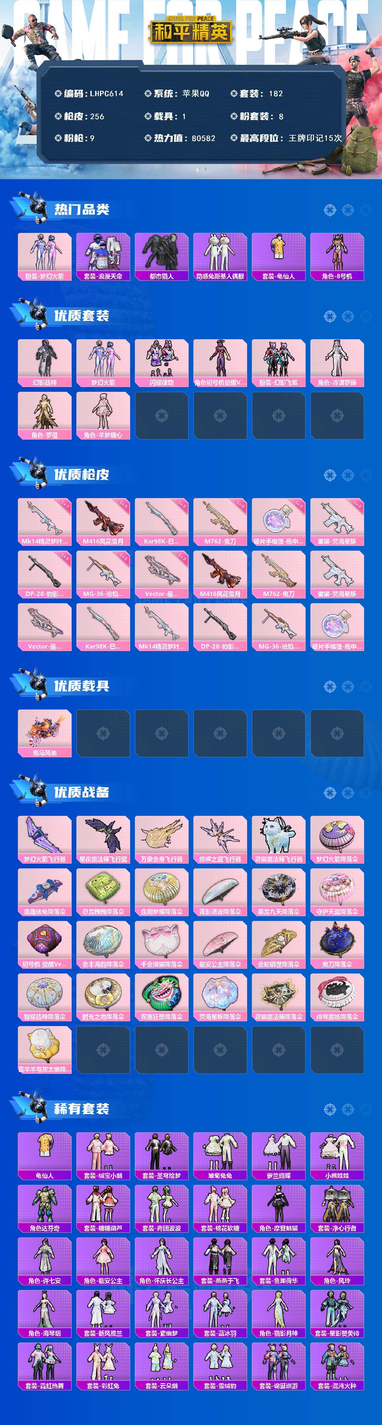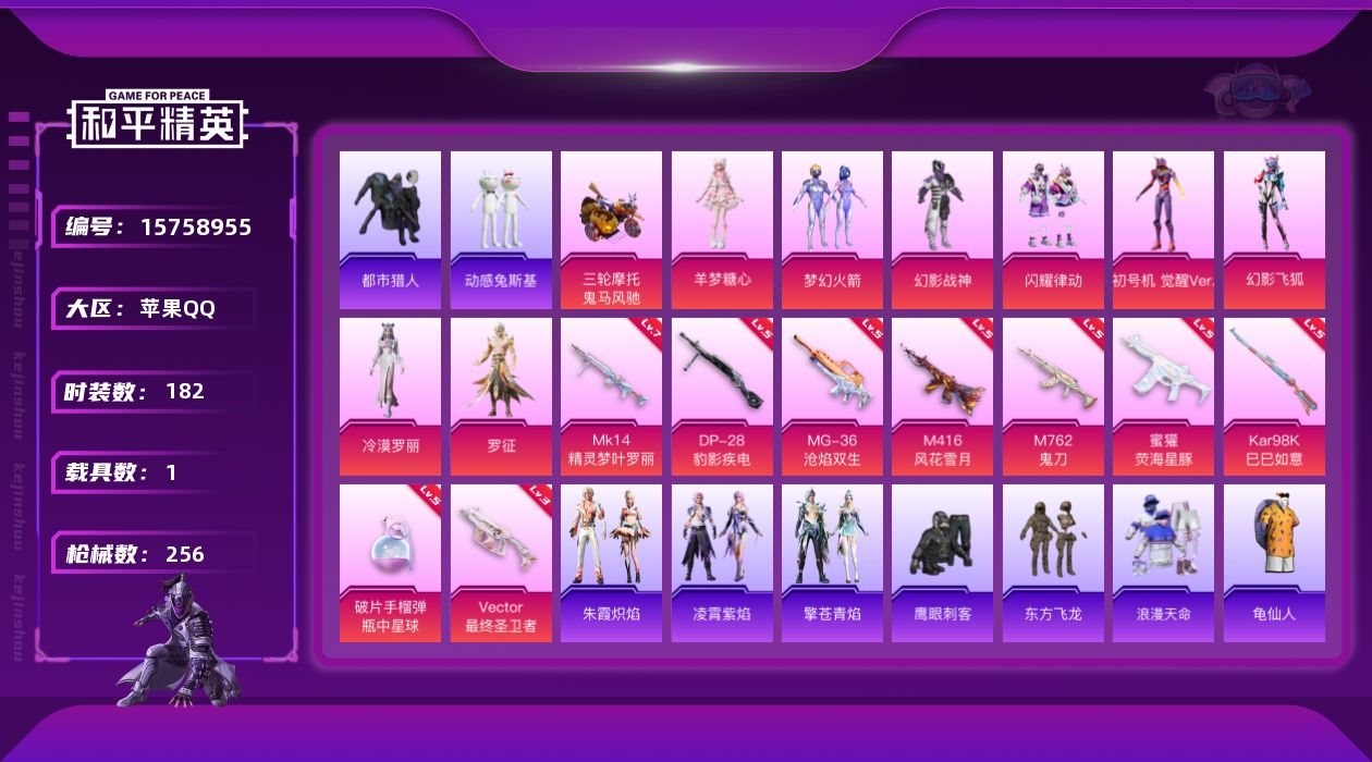 [15758955]【特价出售/店主推荐】苹果 手Q-8粉装-9特效枪-1载具-5粉色飞行器-80582热力值-15王牌印记-182套装-256枪皮 【热门品类】:粉装-梦幻火箭,套装-浪漫天命,套装-都市猎人,套装-动感兔斯基人偶服,套装-龟仙人,角色-8号机 【粉色套装】:粉装-幻影战神,粉装-梦幻火箭,粉装-闪耀律动,角色-初号机 觉醒Ver.,粉装-幻影飞狐,角色-冷漠罗丽,角色-罗征,角色-羊梦糖心 【粉色枪皮等级】:M416-风花雪月(五级),M762-鬼刀(五级),蜜獾-荧海星豚(五级),Vector-最终圣卫者(三级),Kar98K-巳巳如意(五级),Mk14-精灵梦叶罗丽(七级),DP-28-豹影疾电(五级),MG-36-沧焰双生(五级),破片手榴弹-瓶中星球(五级) 【粉色载具】:鬼马风驰 【粉色枪皮】:M416-风花雪月,M762-鬼刀,蜜獾-荧海星豚,Vector-最终圣卫者,Kar98K-巳巳如意,Mk14-精灵梦叶罗丽,DP-28-豹影疾电,MG-36-沧焰双生,破片手榴弹-瓶中星球 【粉色飞行器】:梦幻火箭飞行器,星夜魔法师飞行翼,万象金身飞行器,终晖之翼飞行器,灵猫魔法师飞行器 【粉色降落伞】:梦幻火箭降落伞,童趣迷兔降落伞,恐龙拽拽降落伞,庄周梦蝶降落伞,莲影清波降落伞,墨龙九天降落伞,守护天翼降落伞,初号机 觉醒Ver.降落伞,金丰海韵降落伞,千金淑猫降落伞,临安公主降落伞,金蛇镇世降落伞,鬼刀降落伞,智耀战神降落伞,时光之吻降落伞,双重狂想降落伞,荧海星豚降落伞,灵猫魔法师降落伞,绯穹魔姬降落伞,喜羊羊与灰太狼降落伞 【稀有套装】:套装-龟仙人,套装-绒宝小鹅,套装-圣穹绘梦,套装-雏菊兔兔,套装-萝兰蝴蝶,套装-小熊娃娃,角色-达芬奇,套装-糖糖葫芦,套装-青团波波,套装-棉花软糖,角色-摩登魅猫,套装-净心行者,角色-许七安,角色-临安公主,角色-怀庆长公主,套装-燕燕于飞,套装-鱼渊荷华,角色-风玲,角色-海琴烟,套装-新风雅兰,套装-紫幽梦,套装-蓝冰羽,角色-猎影月神,套装-星影赞美诗,套装-霓虹热舞,套装-彩虹兔,套装-云朵鹅,套装-雪绒豹,套装-诡诞巡游,套装-混沌火种,角色-夜瞳黯灵,套装-朱霞炽焰,套装-凌霄紫焰,套装-擎苍青焰 【稀有枪皮】:AKM-夜灯,AKM-影袭,AKM-恐龙拽拽,AKM-江南烟雨,AKM-灼热熔岩,AK