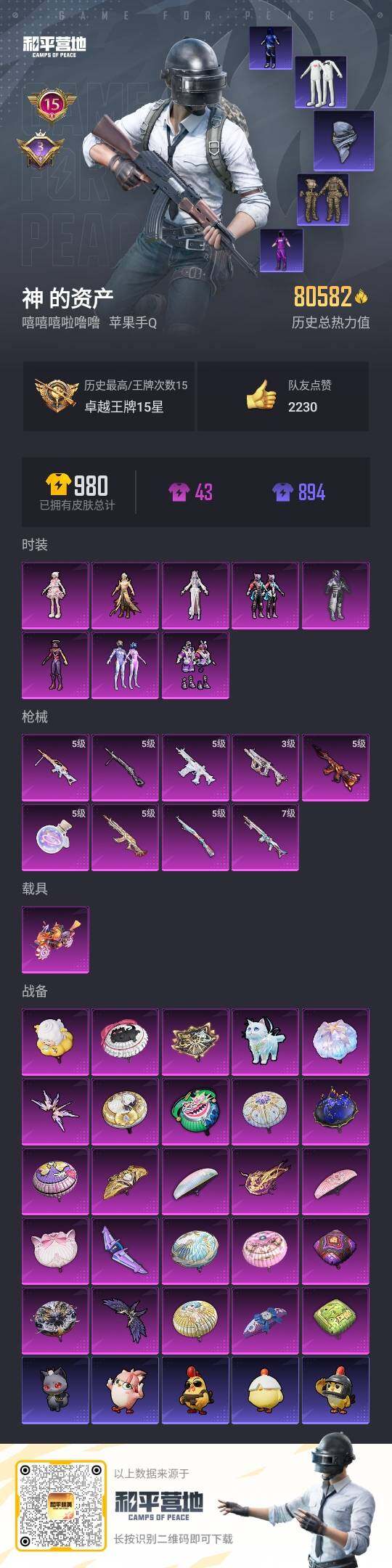 - [14538769]苹果 手Q-无敌战神框-0粉装-0特效枪-0载具-0粉色飞行器-2398热力值-3王牌印记-14套装-12枪皮 【热门品类】:套装-S1赛事 【稀有枪皮】:AKM-破晓战魂,M16A4-红色方程式,SCAR-L-生命誓言,M416-红色方程式,M416-蓝色火焰,AUG-耀粉歌者,汤姆逊-炫彩节奏,汤姆逊-耀粉歌者 【其他套装】:套装-S2赛事,套装-S3赛事,套装-S4赛事,套装-SS17特训,套装-SS18特训,套装-活力之心,套装-碟中谍A款,套装-突袭者,套装-竞技名士,套装-长空猛禽,套装-风行保卫者,套装-夜莺强袭者,套装-坚韧舞者 【营地ID】:491943996
