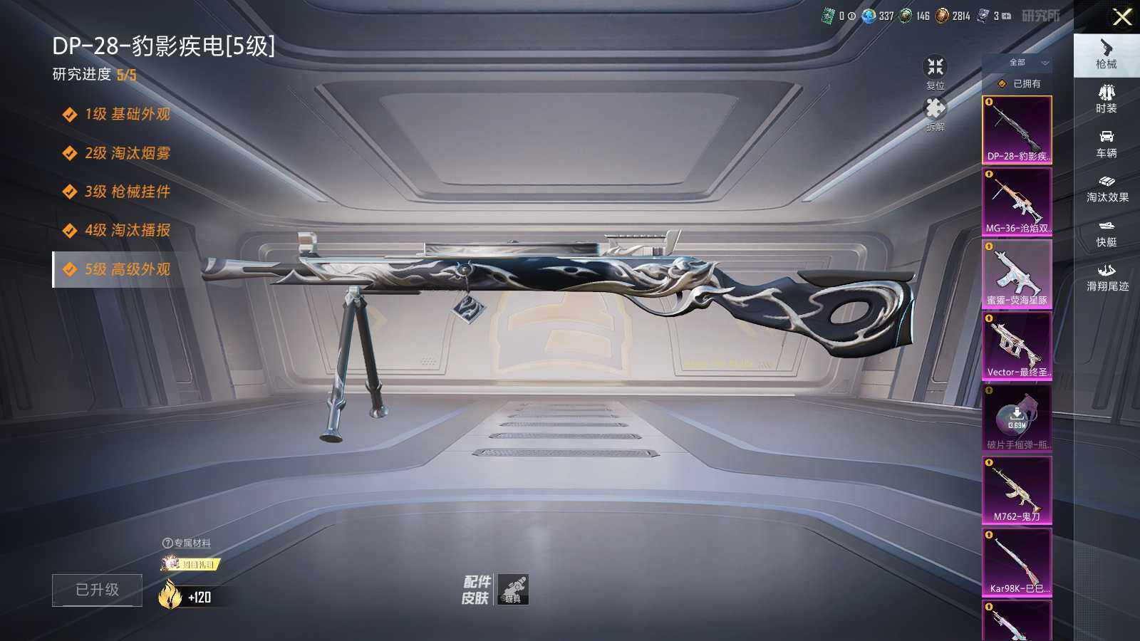 【粉色枪皮等级】:M416-风花雪月(五级),M762-鬼刀(五级),蜜獾-荧海星豚(五级),Vector-最终圣卫者(三级),Kar98K-巳巳如意(五级),Mk14-精灵梦叶罗丽(七级),DP-28-豹影疾电(五级),MG-36-沧焰双生(五级),破片手榴弹-瓶中星球(五级)