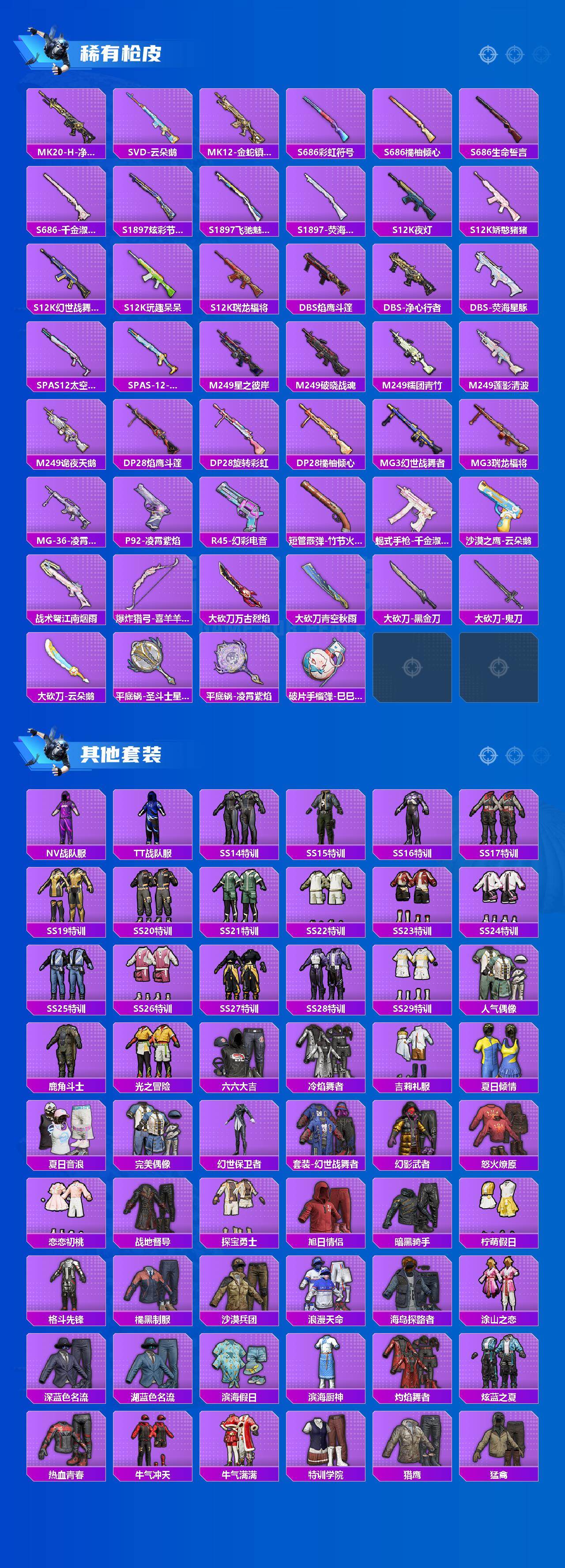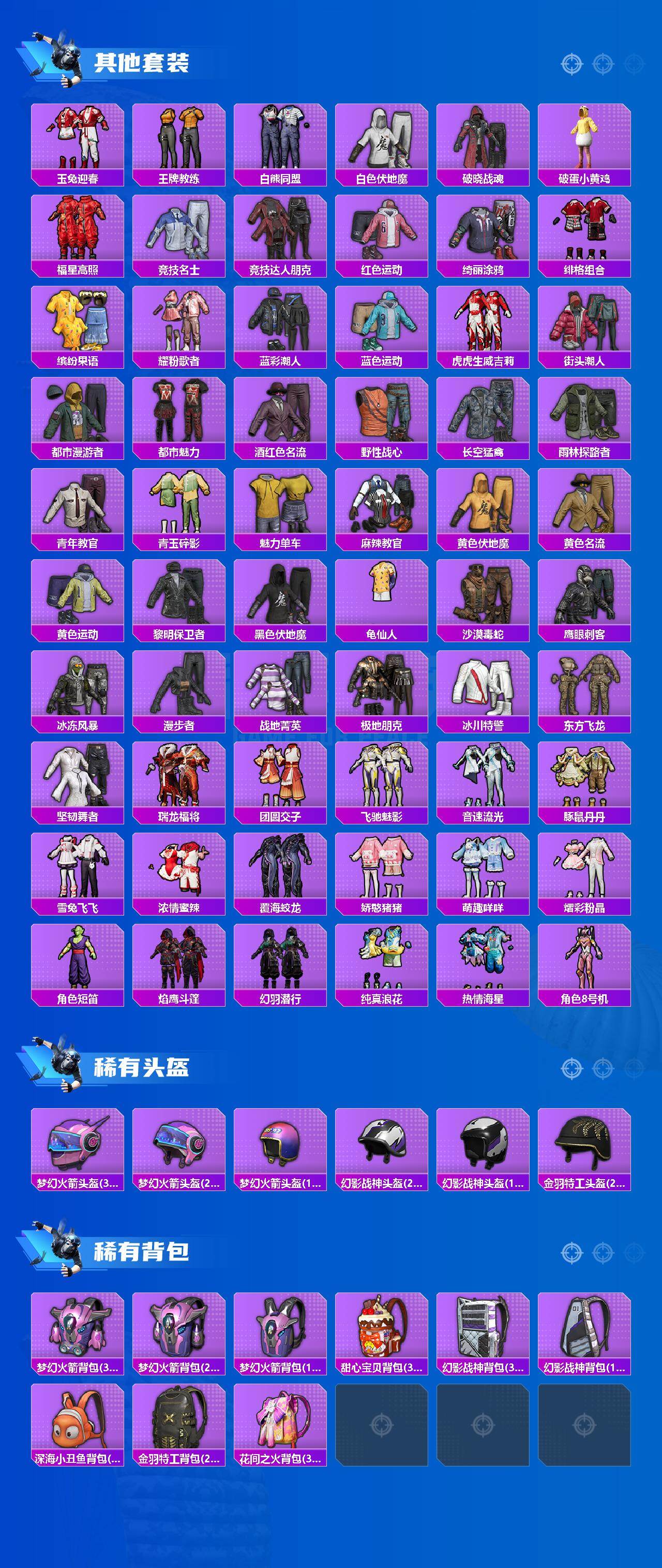 【稀有套装】:套装-龟仙人,套装-绒宝小鹅,套装-圣穹绘梦,套装-雏菊兔兔,套装-萝兰蝴蝶,套装-小熊娃娃,角色-达芬奇,套装-糖糖葫芦,套装-青团波波,套装-棉花软糖,角色-摩登魅猫,套装-净心行者,角色-许七安,角色-临安公主,角色-怀庆长公主,套装-燕燕于飞,套装-鱼渊荷华,角色-风玲,角色-海琴烟,套装-新风雅兰,套装-紫幽梦,套装-蓝冰羽,角色-猎影月神,套装-星影赞美诗,套装-霓虹热舞,套装-彩虹兔,套装-云朵鹅,套装-雪绒豹,套装-诡诞巡游,套装-混沌火种,角色-夜瞳黯灵,套装-朱霞炽焰,套装-凌霄紫焰,套装-擎苍青焰
