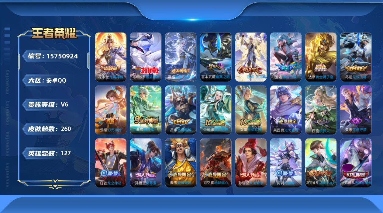 [15750924]【店主推荐捡漏号!可直接换绑】安卓Q-V6-最强王者段位-127英雄-260皮肤-1典藏皮肤-2珍品传说-7传说-72史诗-1星元 【英雄全皮】:孙权全皮,司空震全皮,戈娅全皮,空空儿全皮 【荣耀典藏】:花木兰九霄神辉 【珍品传说】:马可波罗怪盗基德,嫦娥器灵落星盏 【传说皮肤】:司空震愿照山河定,云缨幻光神枪,桑启鸣野蒿,亚连落雪白狼,吕布怒海麟威,马超无双飞将,达摩黄金狮子座 【限定皮肤】:蒙犽顽岩魄,姜子牙天穹之誓,杨戬破阵退雄兵,狄仁杰阴阳师,赵云皇家上将,鲁班七号狮舞东方,周瑜赤莲之焰,夏侯惇朔风刀,甄姬游园惊梦,典韦蓝屏警告,马可波罗山海玄木吟,狄仁杰魔术师,狄仁杰万华元夜,项羽海滩派对,老夫子醍醐杖,程咬金演武夺筹,王昭君凤凰于飞,兰陵王驯魔猎人,孙悟空至尊宝,孙悟空大圣娶亲,牛魔御旌,李元芳云中旅人,钟馗神迹守卫,钟馗驱傩正仪,女娲朔望之晖,干将莫邪胡桃夹子,蔡文姬繁星吟游,鬼谷子原初探秘者,鬼谷子五谷丰年,百里玄策原初追逐者,弈星混沌棋,梦奇顽趣,明世隐疑决卦,裴擒虎李小龙,裴擒虎擒涛扼浪,云中君纤云弄巧,盾山御銮,上官婉儿梁祝,上官婉儿天狼绘梦者,嫦娥暖冬兔眠,西施玲珑珍味,鲁班大师探海日志,桑启海盐诗旅,暃星界游侠,戈娅驭风魔法,艾琳流音漫舞,司空震地狱燃心,阿古朵江河有灵,张良古海寻踪,蒙犽百解令,蒙恬荣光圣徽,高渐离燃音魔法,妲己灵卜魔法,鬼谷子天穹祈灯,姬小满妄想食味,亚连落雪白狼,沈梦溪龙舞盛年,刘邦剑破天穹,程咬金群星魔术团,关羽决胜骁骑,刘备异域游侠,周瑜熔金海岸 【年限皮肤】:王昭君凤凰于飞,马可波罗山海玄木吟 【赛季限定】:夏侯惇朔风刀,狄仁杰万华元夜,老夫子醍醐杖,程咬金演武夺筹,张良古海寻踪,牛魔御旌,李元芳云中旅人,钟馗驱傩正仪,鬼谷子原初探秘者,百里玄策原初追逐者,弈星混沌棋,梦奇顽趣,明世隐疑决卦,裴擒虎擒涛扼浪,盾山御銮,鲁班大师探海日志,桑启海盐诗旅,鬼谷子天穹祈灯,蒙恬荣光圣徽,刘邦剑破天穹,姜子牙天穹之誓 【战令限定】:鲁班七号狮舞东方,周瑜赤莲之焰,典韦蓝屏警告,兰陵王驯魔猎人,艾琳流音漫舞,钟馗神迹守卫,女娲朔望之晖,嫦娥暖冬兔眠,西施玲珑珍味,司空震地狱燃心,暃星界游侠,戈娅驭风魔法,高渐离燃音魔法,妲己灵卜魔法 【史诗皮肤】:项羽苍穹之光,赵云皇家上将,赵云未来纪元,貂蝉圣诞恋歌,甄姬冰雪圆舞曲,王昭