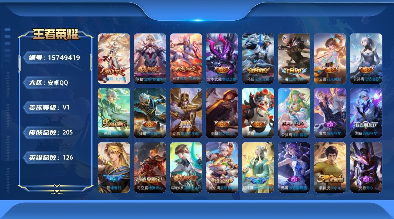 [15749419]【特价急出/详情看图】安卓Q-V0-最强王者段位-126英雄-205皮肤-13传说-1星元-49史诗