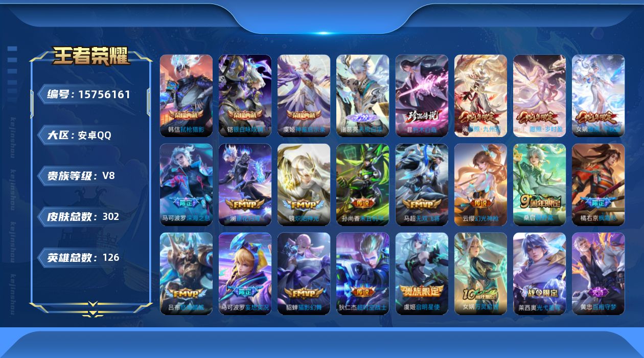 [15756161]账号来源干净 保证账号找回包赔 薄利多销 冲销量 平台保证金向商家安卓Q-V8-最强王者段位-126英雄-302皮肤-3典藏皮肤-1无双-1珍品传说-17传说-84史诗【英雄全皮】:戈娅全皮【荣耀典藏】:铠银白咏叹调,韩信弑枪猎影,虞姬神鉴启示录【无双皮肤】:诸葛亮天机白泽【珍品传说】:暃朽木白哉【传说皮肤】:后羿神树通天,女娲愿照千秋盛,澜愿照九州拓,虞姬愿照岁时盈,云缨幻光神枪,桑启鸣野蒿,澜逐花归海,马可波罗妄想实况,吕布怒海麟威,橘右京枫霜尽,马可波罗深海之息,马超无双飞将,镜炽阳神光,虞姬启明星使,貂蝉猫影幻舞,孙尚香末日机甲,狄仁杰超时空战士【限定皮肤】:蒙犽顽岩魄,蔡文姬夏日便利店,虞姬夏日便利店,姜子牙天穹之誓,杨戬破阵退雄兵,狄仁杰阴阳师,赵云皇家上将,赵云引擎之心,孙尚香蔷薇恋人,庄周高山流水,钟无艳王者之锤,元歌云间偶戏,马可波罗暗影游猎,马可波罗深海之息,马可波罗妄想实况,狄仁杰魔术师,狄仁杰万华元夜,达摩沙漠行僧,项羽海滩派对,老夫子醍醐杖,程咬金演武夺筹,王昭君午后时光,兰陵王驯魔猎人,兰陵王金庭之子,橘右京枫霜尽,孙悟空至尊宝,孙悟空孙行者,牛魔御旌,李元芳云中旅人,虞姬启明星使,钟馗驱傩正仪,杨玉环遇见飞天,雅典娜黎明之约,鬼谷子原初探秘者,鬼谷子五谷丰年,苏烈千军破阵,百里守约朱雀志,弈星混沌棋,沈梦溪大漠名商,明世隐疑决卦,裴擒虎李小龙,裴擒虎擒涛扼浪,狂铁电玩高手,米莱狄御霄,云中君纤云弄巧,上官婉儿梁祝,西施玲珑珍味,蒙犽狂想玩偶喵,鲁班大师探海日志,桑启海盐诗旅,戈娅驭风魔法,阿古朵江河有灵,张良古海寻踪,蒙犽百解令,鬼谷子天穹祈灯,伽罗琥珀纪元,姬小满妄想食味,沈梦溪龙舞盛年,刘邦剑破天穹,程咬金群星魔术团,镜青焰无极,项羽苍威无极,周瑜熔金海岸