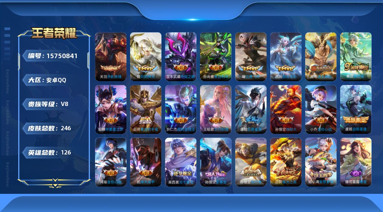 [15750841]【特价出售/店主推荐】:安卓Q-V8-永恒钻石I段位-126英雄-245皮肤-1典藏皮肤-17传说-53史诗