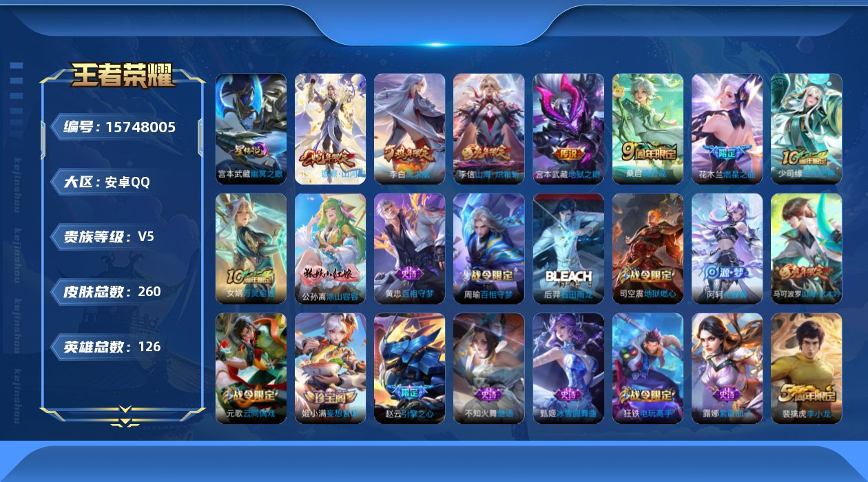 [15748005]【特价急出/详情看图】安卓Q-V5-最强王者段位-126英雄-260皮肤-1星元-8传说-58史诗