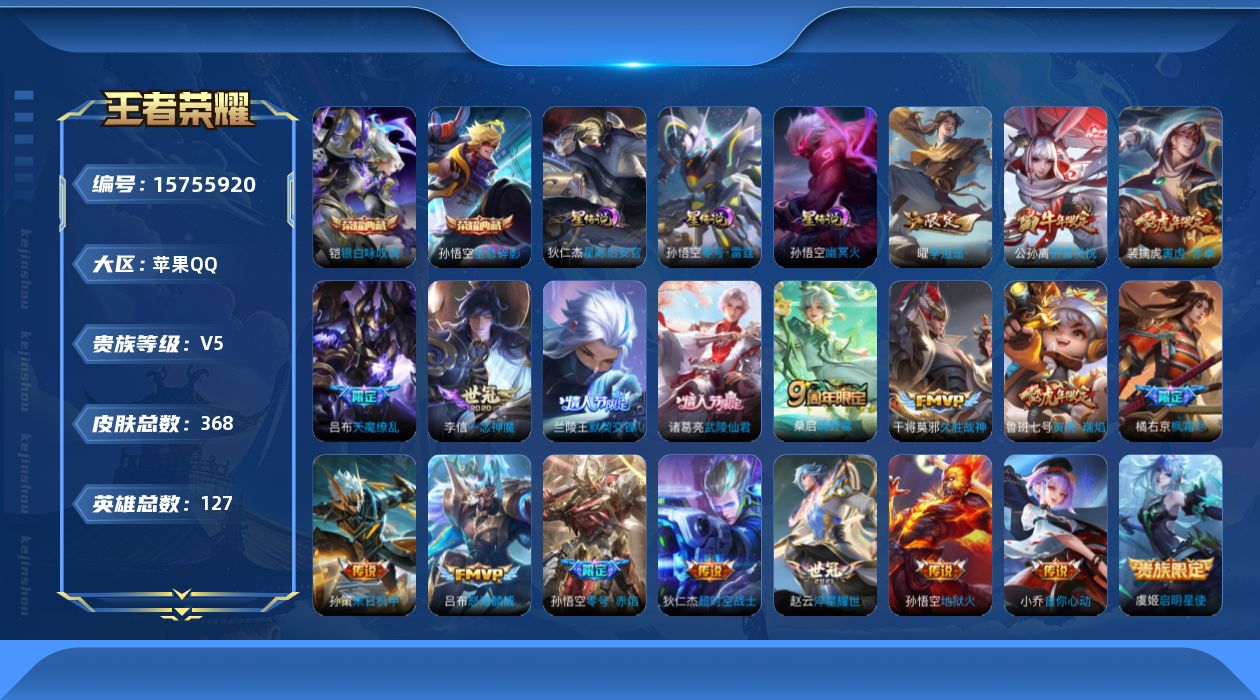[15755920]可二次【特价急出/详情看图】苹果Q-V5-最强王者段位-127英雄-368皮肤-2典藏皮肤-4星元-20传说-115史诗