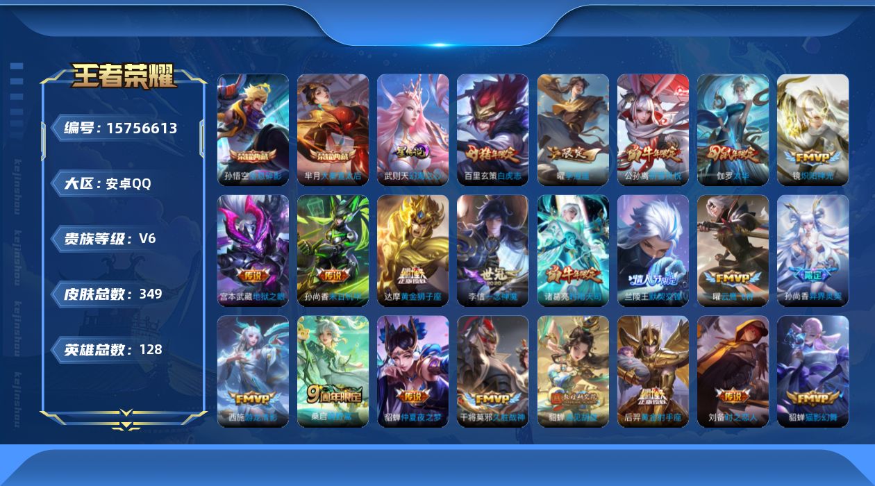 [15756613]可二次【特价出售/店主推荐】安卓Q-V6-最强王者段位-128英雄-349皮肤-2典藏皮肤-1典藏英雄-1星传说-36传说-105史诗 【英雄全皮】:猪八戒全皮 【荣耀典藏】:武则天英雄,孙悟空全息碎影,芈月大秦宣太后 【传说皮肤】:后羿神树通天,桑启鸣野蒿,孙尚香异界灵契,貂蝉遇见胡旋,赵云淬星耀世,王昭君乞巧织情,西施游龙清影,曜李逍遥 ,周瑜音你心动,小乔音你心动,李元芳飞鸢探春,兰陵王默契交锋,公孙离祈雪灵祝,诸葛亮时雨天司,铠绛天战甲,镜炽阳神光,孙悟空零号赤焰,曜云鹰飞将,李信一念神魔,刘备时之恋人,伽罗太华,貂蝉猫影幻舞,张良黄金白羊座,干将莫邪久胜战神,虞姬云霓雀翎,达摩黄金狮子座,百里玄策白虎志,花木兰冠军飞将,梦奇胖达荣荣,后羿黄金射手座,貂蝉仲夏夜之梦,孙尚香末日机甲,宫本武藏地狱之眼,孙悟空地狱火,武则天海洋之心,狄仁杰超时空战士 【限定皮肤】:白起狰,狄仁杰阴阳师,虞姬凯尔特女王,赵云皇家上将,赵云引擎之心,墨子神迹守卫,嬴政白昼王子,孙尚香蔷薇恋人,孙尚香异界灵契,鲁班七号乒乒小将,高渐离死亡摇滚,钟无艳王者之锤,孙膑妖精王,孙膑天狼运算者,扁鹊炼金王,芈月重明,芈月白晶晶,吕布猎兽之王,吕布御风骁将,周瑜赤莲之焰,元歌云间偶戏,元歌无心,夏侯惇朔风刀,甄姬游园惊梦,曹操烛龙,典韦穷奇,马可波罗逐梦之星,马可波罗暗影游猎,狄仁杰魔术师,狄仁杰万华元夜,达摩星际陆战队,项羽海滩派对,项羽霸王别姬,老夫子醍醐杖,老夫子航海奇遇记,关羽冰锋战神,貂蝉遇见胡旋,程咬金演武夺筹,露娜一生所爱,刘邦夺宝奇兵,韩信逐梦之影,兰陵王默契交锋,兰陵王驯魔猎人,花木兰默契交锋,亚瑟潮玩骑士王,孙悟空大圣娶亲,孙悟空零号赤焰,孙悟空孙行者,牛魔奔雷神使,张飞虎魄,李元芳云中旅人,虞姬霸王别姬,钟馗驱傩正仪,杨玉环遇见飞天,干将莫邪冰霜恋舞曲,雅典娜单词大作战,蔡文姬奇迹圣诞,太乙真人饕餮,太乙真人华丽摇滚,东皇太一逐梦之光,鬼谷子原初探秘者,诸葛亮时雨天司,大乔白鹤梁神女,铠青龙志,百里玄策白虎志,百里玄策原初追逐者,弈星混沌棋,公孙离蜜橘之夏,公孙离祈雪灵祝,明世隐疑决卦,裴擒虎李小龙,狂铁御狮,米莱狄御霄,米莱狄胡桃异想国,伽罗太华,伽罗天狼溯光者,盾山御銮,猪八戒西部大镖客,猪八戒猪悟能,上官婉儿梁祝,嫦娥拒霜思,曜李逍遥 ,蒙犽狂想玩偶喵,桑启海盐诗