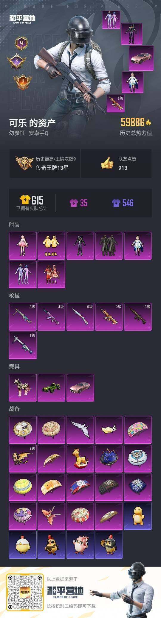 [15759061]安卓 手Q-7粉装-6特效枪-3载具-5粉色飞行器-60408热力值-9王牌印记-116套装-177枪皮