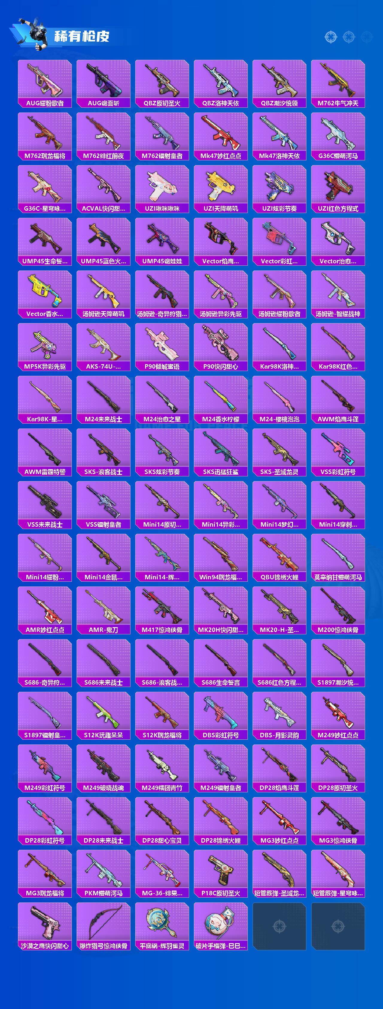 【稀有枪皮】:AKM-夜灯,AKM-彩虹符号,AKM-破晓战魂,AKM-缤纷海域,AKM-虎虎生威,AKM-锦绣火鲤,AKM-霓虹街区,AKM-龙的传人,M16A4-红色方程式,M16A4-蓝色火焰,SCAR-L-夜灯,SCAR-L-未来战士,SCAR-L-浪客战士,SCAR-L-炫彩节奏,SCAR-L-红色方程式,SCAR-L-黄金龙骨,M416-潮汐统领,M416-红色方程式,M416-绯红前夜,M416-蓝色火焰,GROZA-异彩先驱,GROZA-懵萌河马,GROZA-治愈之星,AUG-天降萌叽,AUG-耀粉歌者,AUG-诡面斩,QBZ-原初圣火,QBZ-洛神天依,QBZ-潮汐统领,M762-牛气冲天,M762-瑞龙福将,M762-绯红前夜,M762-