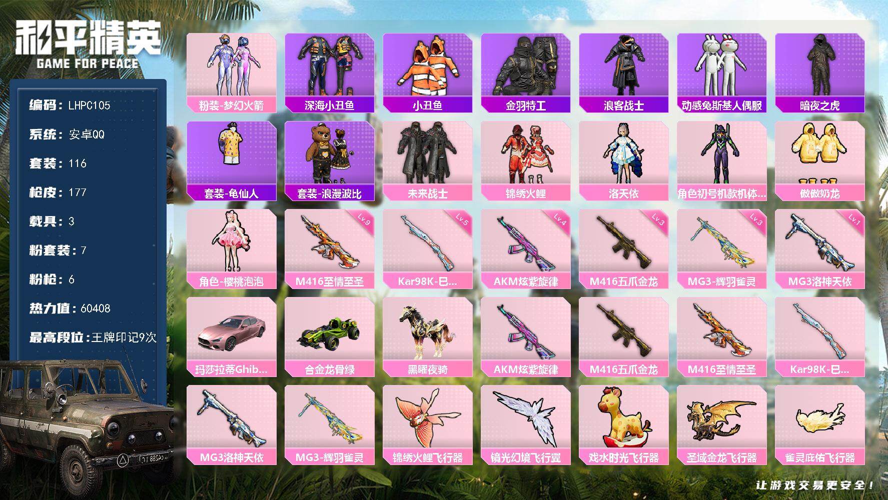[15759061]安卓 手Q-7粉装-6特效枪-3载具-5粉色飞行器-60408热力值-9王牌印记-116套装-177枪皮 【热门品类】:粉装-梦幻火箭,套装-深海小丑鱼,套装-小丑鱼,套装-金羽特工,套装-浪客战士,套装-动感兔斯基人偶服,套装-暗夜之虎,套装-龟仙人,套装-浪漫波比 【粉色套装】:粉装-未来战士,粉装-梦幻火箭,粉装-锦绣火鲤,角色-洛天依,角色-初号机款机体服,粉装-傲傲奶龙,角色-樱桃泡泡 【粉色枪皮等级】:AKM-炫紫旋律(四级),M416-五爪金龙(三级),M416-至情至圣(九级),Kar98K-巳巳如意(五级),MG3-洛神天依(一级),MG3-辉羽雀灵(三级) 【粉色载具】:玛莎拉蒂Ghibli(粉),合金龙骨(绿),黑曜夜骑 【粉色枪皮】:AKM-炫紫旋律,M416-五爪金龙,M416-至情至圣,Kar98K-巳巳如意,MG3-洛神天依,MG3-辉羽雀灵 【粉色飞行器】:锦绣火鲤飞行器,镜光幻境飞行翼,戏水时光飞行器,圣域金龙飞行器,雀灵庇佑飞行器 【粉色降落伞】:未来战士降落伞,梦幻火箭降落伞,潮汐统领降落伞,锦绣火鲤降落伞,香水柠檬降落伞,洛神天依降落伞,变形金刚降落伞,萌酷奶龙降落伞,未来领航者降落伞,鬼刀降落伞,圣域龙灵降落伞,百变魔方降落伞,星穹咏叹调降落伞,时光之吻降落伞,炫彩糖果降落伞 【稀有套装】:套装-龟仙人,套装-巳巳如意,套装-燕燕于飞,套装-鱼渊荷华,角色-风玲,套装-樱梦幻音,套装-粉恋花,套装-紫幽梦,套装-蓝冰羽,套装-星影赞美诗,套装-星渊小夜曲,角色-灵公主 【稀有枪皮】:AKM-夜灯,AKM-彩虹符号,AKM-破晓战魂,AKM-缤纷海域,AKM-虎虎生威,AKM-锦绣火鲤,AKM-霓虹街区,AKM-龙的传人,M16A4-红色方程式,M16A4-蓝色火焰,SCAR-L-夜灯,SCAR-L-未来战士,SCAR-L-浪客战士,SCAR-L-炫彩节奏,SCAR-L-红色方程式,SCAR-L-黄金龙骨,M416-潮汐统领,M416-红色方程式,M416-绯红前夜,M416-蓝色火焰,GROZA-异彩先驱,GROZA-懵萌河马,GROZA-治愈之星,AUG-天降萌叽,AUG-耀粉歌者,AUG-诡面斩,QBZ-原初圣火,QBZ-洛神天依,QBZ-潮汐统领,M762-牛气冲天,M762-瑞龙福将,M762-绯红前夜,M762-