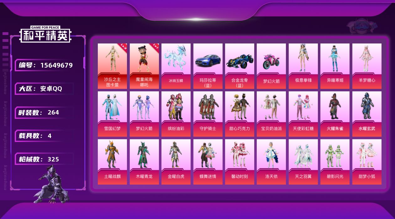 [15649679]【店主推荐捡漏号!可直接换绑】安卓 手Q-2神装-29粉装-14特效枪-4载具-12粉色飞行器-132238热力值-20王牌印记-264套装-325枪皮【红色神装等级】:魔童闹海-哪吒(一级),沙丘之主-图卡盟(三级)【红色角色神装】:魔童闹海-哪吒,沙丘之主-图卡盟【热门品类】:粉装-雪国幻梦,粉装-梦幻火箭,粉装-缤纷油彩,套装-浪漫天命,套装-忍者信条,套装-龟仙人,套装-潮萌小黄鸭,套装-暗影哥特,套装-浪漫波比,套装-粉红小猪,套装-红熊茄茄【粉色套装】:粉装-守护骑士,粉装-甜心巧克力,粉装-宝贝奶油派,粉装-天使彩虹糖,粉装-火曜朱雀,粉装-水曜玄武,粉装-土曜战麒,粉装-木曜青龙,粉装-金曜白虎,粉装-雪国幻梦,粉装-蝶舞迷情,粉装-梦幻火箭,粉装-缤纷油彩,粉装-馨动时刻,角色-洛天依,粉装-天之羽翼,粉装-碧影闪光,粉装-甜梦小狐,角色-复仇流浪者,粉装-垂柳戏鸭,粉装-第五大道,粉装-闲梦青缨,角色-圣堂之誓,套装-创世·救赎,角色-千金淑猫,角色-绯穹魔姬,角色-羊梦糖心,角色-异瞳寒姬,粉装-极意拳锋【粉色枪皮等级】:AKM-绿萝繁花(五级),M16A4-垂柳戏鸭(七级),SCAR-L-纯梦嫁纱(二级),SCAR-L-魔童闹海 哪吒(三级),M416-五爪金龙(七级),AUG-妙趣可丽(七级),蜜獾-异瞳寒姬(六级),Kar98K-巳巳如意(五级),M24-镜域双华(三级),M249-彩虹甜喵(七级),DP-28-圣堂之誓(七级),DP-28-豹影疾电(五级),MG3-洛神天依(三级),MG-36-沧焰双生(五级)【粉色载具】:玛莎拉蒂Ghibli(蓝),合金龙骨(蓝),双人摩托-梦幻火箭,冰绡玉鳞【粉色枪皮】:AKM-绿萝繁花,M16A4-垂柳戏鸭,SCAR-L-纯梦嫁纱,SCAR-L-魔童闹海 哪吒,M416-五爪金龙,AUG-妙趣可丽,蜜獾-异瞳寒姬,Kar98K-巳巳如意,M24-镜域双华,M249-彩虹甜喵,DP-28-圣堂之誓,DP-28-豹影疾电,MG3-洛神天依,MG-36-沧焰双生【粉色飞行器】:酣梦熊熊飞行器,春暖花开飞行器,梦幻火箭飞行器,闪光银龙飞行器,沙丘之主天马,镜域双华-灵镜之阶,龙翔九天飞行器,飞天猪飞行器