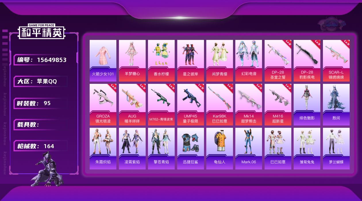 - PX_2109933- 苹果手Q-7王牌印记-6粉装-7特效枪-1载具-62021热力值-161套装-202枪皮-3卓越印记-1传奇印记 【6粉装】,梦幻火箭,放客神游,凤凰座 一辉,荧海星豚,萨利娅,幻影战神 【7特效枪】AKM-绿萝繁花-5级 SCAR-L-锦绣绵绵-5级 M416-女娲灵识-3级 GROZA-镜光银凌-5级 AUG-暖羊咩咩-5级 Kar98K-巳巳如意-5级 DP-28-豹