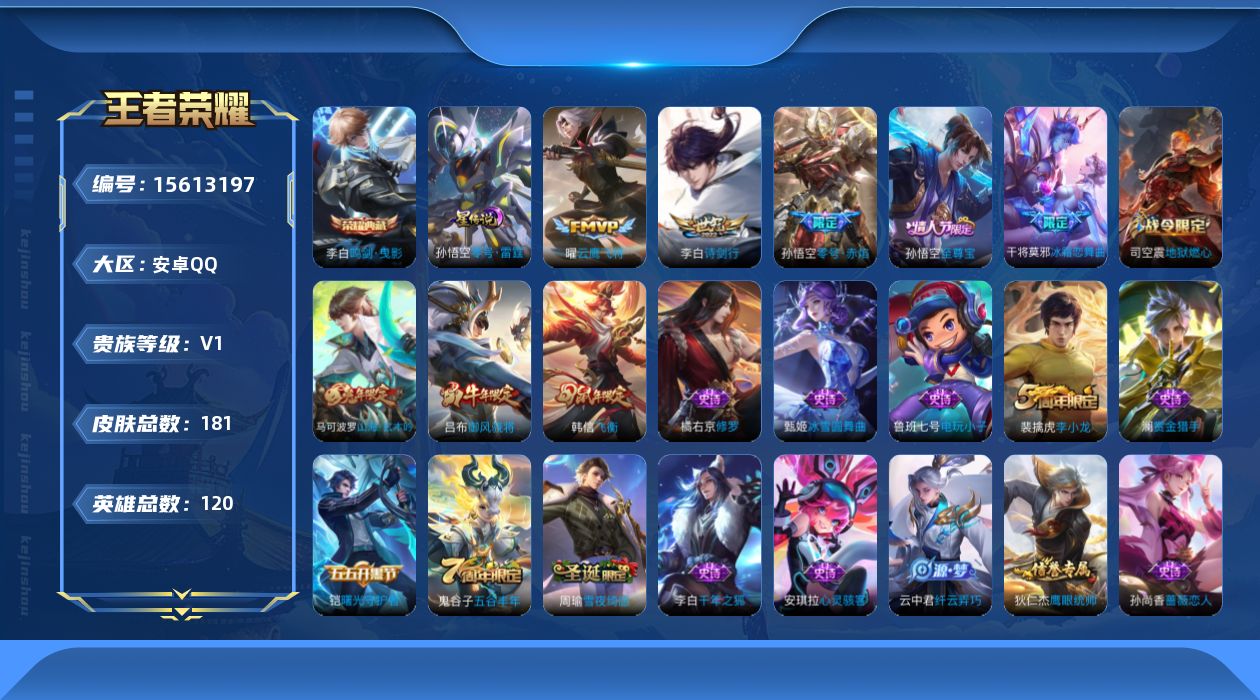 [15613197]【特价出售/店主推荐】安卓Q-V0-荣耀黄金II段位-120英雄-181皮肤-1典藏皮肤-3传说-49史诗-1星元 【荣耀典藏】:李白鸣剑曳影 【传说皮肤】:李白诗剑行,孙悟空零号赤焰,曜云鹰飞将 【限定皮肤】:白起狰,狄仁杰阴阳师,虞姬凯尔特女王,赵云皇家上将,嬴政优雅恋人,孙尚香蔷薇恋人,庄周高山流水,高渐离死亡摇滚,扁鹊炼金王,芈月重明,吕布御风骁将,夏侯惇朔风刀,甄姬游园惊梦,曹操烛龙,典韦穷奇,马可波罗山海玄木吟,狄仁杰魔术师,狄仁杰万华元夜,达摩星际陆战队,达摩沙漠行僧,项羽海滩派对,老夫子醍醐杖,程咬金演武夺筹,韩信飞衡,兰陵王金庭之子,孙悟空至尊宝,孙悟空零号赤焰,牛魔御旌,李元芳云中旅人,钟馗驱傩正仪,杨玉环遇见飞天,干将莫邪冰霜恋舞曲,雅典娜黎明之约,太乙真人饕餮,太乙真人华丽摇滚,鬼谷子原初探秘者,鬼谷子五谷丰年,苏烈千军破阵,百里玄策原初追逐者,弈星混沌棋,梦奇顽趣,沈梦溪大漠名商,明世隐疑决卦,裴擒虎李小龙,裴擒虎擒涛扼浪,狂铁御狮,云中君纤云弄巧,盾山御銮,上官婉儿梁祝,鲁班大师探海日志,桑启海盐诗旅,艾琳流音漫舞,司空震地狱燃心,阿古朵江河有灵,张良古海寻踪,鬼谷子天穹祈灯 【年限皮肤】:吕布御风骁将,韩信飞衡,马可波罗山海玄木吟 【赛季限定】:扁鹊炼金王,白起狰,芈月重明,夏侯惇朔风刀,曹操烛龙,典韦穷奇,狄仁杰万华元夜,达摩沙漠行僧,老夫子醍醐杖,程咬金演武夺筹,兰陵王金庭之子,张良古海寻踪,牛魔御旌,李元芳云中旅人,虞姬凯尔特女王,钟馗驱傩正仪,雅典娜黎明之约,太乙真人饕餮,鬼谷子原初探秘者,苏烈千军破阵,百里玄策原初追逐者,弈星混沌棋,梦奇顽趣,沈梦溪大漠名商,明世隐疑决卦,裴擒虎擒涛扼浪,狂铁御狮,盾山御銮,鲁班大师探海日志,桑启海盐诗旅,鬼谷子天穹祈灯 【战令限定】:达摩星际陆战队,艾琳流音漫舞,司空震地狱燃心 【史诗皮肤】:鲁班七号电玩小子,项羽苍穹之光,赵云皇家上将,赵云未来纪元,甄姬冰雪圆舞曲,狄仁杰魔术师,宫本武藏鬼剑武藏,孙尚香蔷薇恋人,孙尚香水果甜心,嬴政优雅恋人,嬴政摇滚巨星,妲己魅力维加斯,墨子金属风暴,吕布圣诞狂欢,李白千年之狐,张飞乱世虎臣,孙悟空至尊宝,兰陵王暗隐猎兽者,诸葛亮黄金分割率,甄姬游园惊梦,雅典娜冰冠公主,安琪拉心灵骇客,百里守约特工魅影,铠曙光守护者,蔡文姬舞动绿茵,刘禅天才门将,李元芳