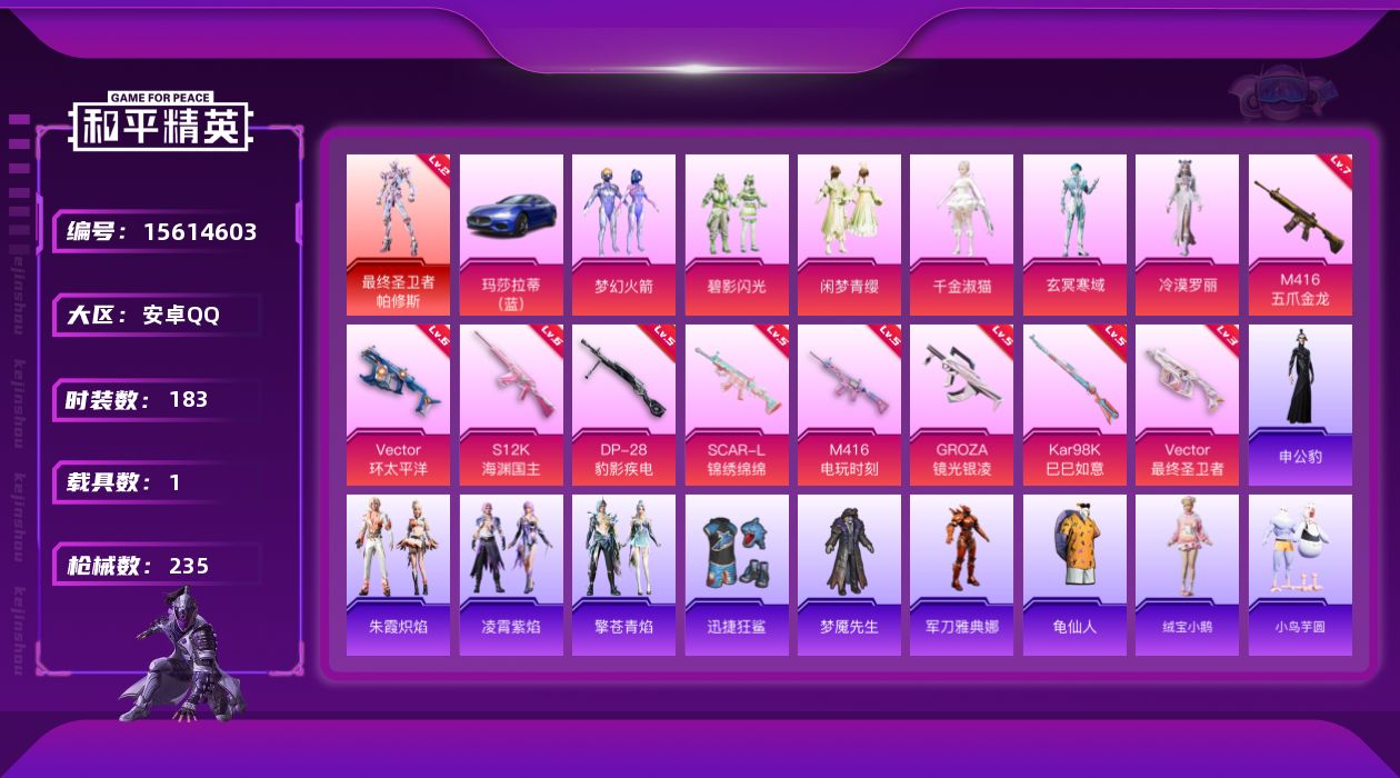 - [14258604]安卓 手Q-6神装-20粉装-19特效枪-7载具-16粉色飞行器-98718热力值-5王牌印记-158套装-237枪皮 【红色神装等级】:圣域龙灵-瑞拉(一级),金蛇镇世-烛九(二级),盛世惊鸿-云鸾(一级),宇宙意志-塞卢姆(一级),墨龙九天-敖渊(一级),沙丘之主-图卡盟(三级) 【红色角色神装】:圣域龙灵-瑞拉,金蛇镇世-烛九,盛世惊鸿-云鸾,宇宙意志-塞卢姆,墨龙九天-敖渊,沙丘之主-图卡盟 【热门品类】:角色-军刀雅典娜,套装-龟仙人,套装-浪漫波比,套装-粉红小猪,角色-六号稻草人 【粉色载具】:玛莎拉蒂Ghibli(粉),疾风龙骑,盛世惊鸿摩托车,最终圣卫者摩托车,僚机-圣域龙宝,星梦玉骢,护世瑞兽,晶梦灵驹 【粉色套装】:粉装-冰霜白皇,粉装-炙焰赤龙,粉装-飓风飞鹰,粉装-蜜桃特工,粉装-林间仙鹿,粉装-彩虹鹿灵,粉装-齐天大圣,粉装-蓝莓炮弹,粉装-赤焰黑爵,粉装-星夜魔法师,角色-烟云彩露,角色-星梦奇缘,角色-月影灵韵,角色-女娲灵识,角色-晶梦幻蝶,角色-智耀战神,粉装-幻彩电音,角色-狂魅哈莉,角色-狂魇小丑,角色-宁雨蝶 【粉色枪皮等级】:AKM-魔法神域(三级),AKM-幽焰骑士(三级),M16A4-晶梦幻蝶(二级),SCAR-L-金蛇镇世(六级),M416-墨龙九天(三级),UMP45-宇宙意志(三级),Vector-最终圣卫者(三级),AKS-74U-星穹咏叹调(一级),P90-沙丘之主(三级),Kar98K-巳巳如意(五级),Kar98K-圣域龙灵(三级),M24-镜域双华(三级),Mk14-盛世惊鸿(一级),Mk14-樱桃泡泡(一级),DP-28-豹影疾电(一级),MG3-洛神天依(七级),MG3-辉羽雀灵(二级),烟雾弹-丁香清露(五级),破片手榴弹-瓶中星球(四级) 【粉色枪皮】:AKM-魔法神域,AKM-幽焰骑士,M16A4-晶梦幻蝶,SCAR-L-金蛇镇世,M416-墨龙九天,UMP45-宇宙意志,Vector-最终圣卫者,AKS-74U-星穹咏叹调,P90-沙丘之主,Kar98K-巳巳如意,Kar98K-圣域龙灵,M24-镜域双华,Mk14-盛世惊鸿,Mk14-樱桃泡泡,DP-28-豹影疾电,MG3-洛神天依,MG3-辉羽雀灵,烟雾弹-丁香清露,破片手榴弹-瓶中星球 【粉色飞行器】:酣梦熊熊飞行器,相思残雪飞行器,