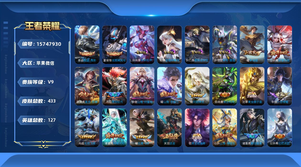[15747930]微信永久社交限制介意勿拍!苹果WX-V9-永恒钻石IV段位-127英雄-433皮肤-2典藏皮肤-40传说-147史诗-5星传 【英雄全皮】:刘邦全皮,橘右京全皮,李信全皮,猪八戒全皮,鲁班大师全皮,影全皮 【荣耀典藏】:夏侯惇无限飓风号,李白鸣剑曳影 【传说皮肤】:桑启鸣野蒿,铠冥王哈迪斯,马超琥珀纪元,东皇太一灼幽烈阳,诸葛亮鹤羽星尊,公孙离记忆之芯,花木兰燃星之曲,虞姬无限倾心,项羽无限倾心,伽罗炽翼辉光,小乔山海琳琅生,曜山海苍雷引,李信山海炽霜斩,吕布怒海麟威,橘右京枫霜尽,后羿无尽星芒,马超无双飞将,露娜启示之音,孙策末日机甲,裴擒虎寅虎赤拳,鲁班七号寅虎瑞焰,赵云淬星耀世,曜李逍遥 ,公孙离祈雪灵祝,诸葛亮时雨天司,铠绛天战甲,镜炽阳神光,虞姬启明星使,孙悟空零号赤焰,关羽武圣,曜云鹰飞将,李信一念神魔,干将莫邪久胜战神,达摩黄金狮子座,花木兰冠军飞将,梦奇胖达荣荣,后羿黄金射手座,貂蝉仲夏夜之梦,孙尚香末日机甲,狄仁杰超时空战士 【限定皮肤】:铠冥王哈迪斯,姜子牙天穹之誓,狄仁杰阴阳师,廉颇寅虎御盾,小乔山海琳琅生,赵云皇家上将,赵云引擎之心,赵云龙胆,墨子神迹守卫,墨子降魔,嬴政优雅恋人,嬴政白昼王子,孙尚香蔷薇恋人,鲁班七号狮舞东方,鲁班七号乒乒小将,鲁班七号寅虎瑞焰,庄周云端筑梦师,庄周高山流水,高渐离死亡摇滚,高渐离玩趣恶龙,阿轲迷踪丽影,钟无艳超时空战士,孙膑天狼运算者,孙膑寅虎展翼,扁鹊奇幻香踪,白起夜都怪侠,芈月白晶晶,芈月幻夜卜梦,吕布猎兽之王,吕布御风骁将,周瑜赤莲之焰,元歌云间偶戏,元歌无心,夏侯惇朔风刀,夏侯惇匿光决锋者,甄姬落雪兰心,曹操天狼征服者,典韦蓝屏警告,典韦岱宗,马可波罗逐梦之星,马可波罗暗影游猎,马可波罗山海玄木吟,狄仁杰魔术师,狄仁杰万华元夜,达摩星际陆战队,达摩沙漠行僧,项羽海滩派对,项羽霸王别姬,项羽无限倾心,老夫子醍醐杖,老夫子航海奇遇记,关羽冰锋战神,关羽武圣,关羽百相守梦,程咬金演武夺筹,露娜一生所爱,露娜启示之音,刘邦夺宝奇兵,韩信飞衡,韩信傲雪梅枪,王昭君午后时光,兰陵王驯魔猎人,兰陵王金庭之子,花木兰青春决赛季,花木兰瑞麟志,花木兰默契交锋,花木兰燃星之曲,橘右京枫霜尽,亚瑟潮玩骑士王,孙悟空至尊宝,孙悟空零号赤焰,牛魔御旌,牛魔奔雷神使,后羿如梦令,后羿圣弓游侠,后羿无尽星芒,张飞虎魄,李元芳银