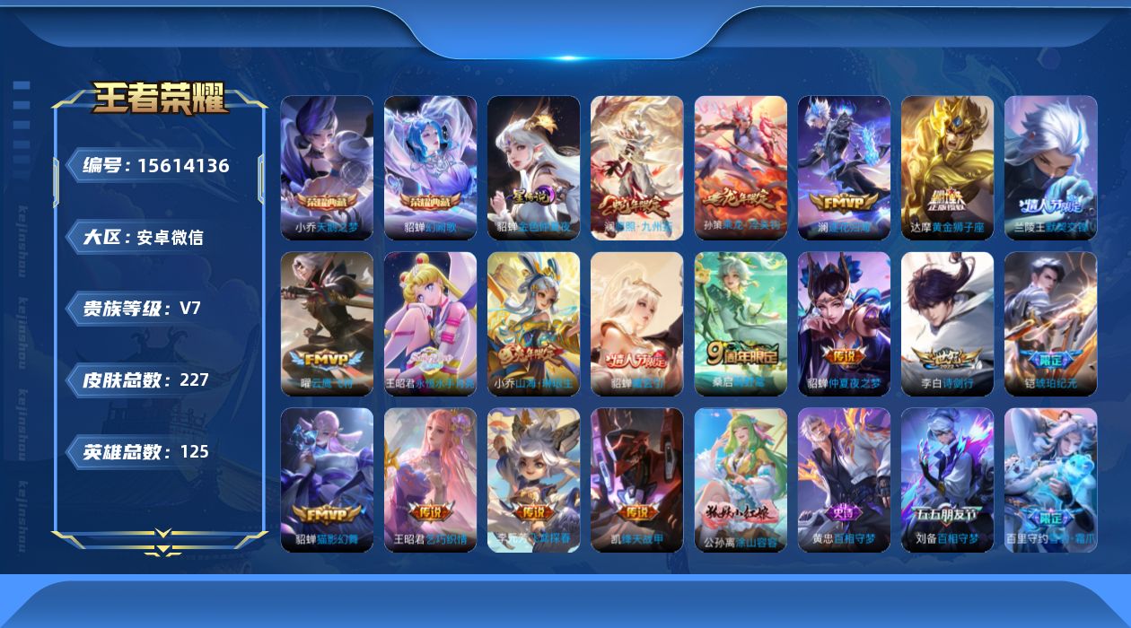 [15614136]安卓WX-V7-最强王者段位-125英雄-227皮肤-2典藏皮肤-18传说-75史诗-1星传说