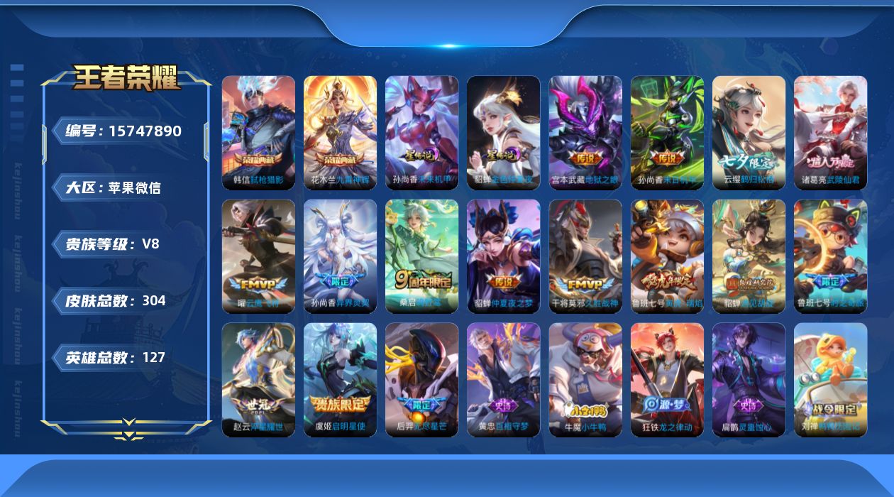 [15747890]苹果WX-V8-最强王者段位-127英雄-304皮肤-2典藏皮肤-15传说-106史诗-2星传