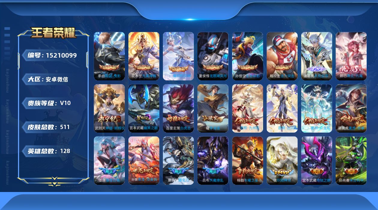 [15210099]【店主推荐捡漏号!可直接换绑】/对抗路43段/游走34段,安卓WX-V10-最强王者段位-128英雄-511皮肤-6典藏皮肤-1典藏英雄-3无双-52传说-167史诗