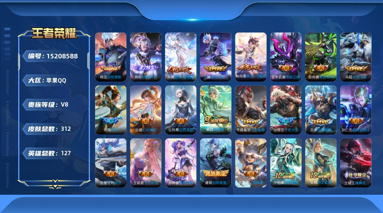 [15208588]苹果Q-V8-最强王者段位-127英雄-312皮肤-1典藏皮肤-1无双-20传说-83史诗