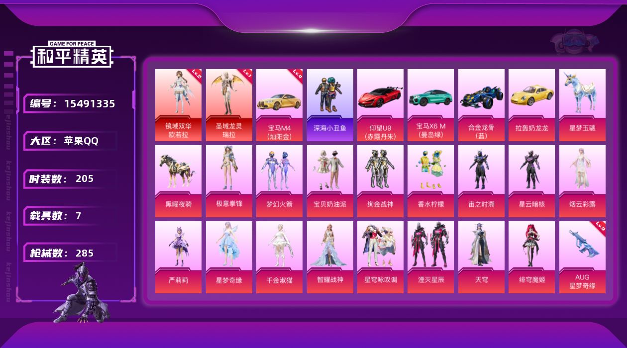 - [15258869]可二次【店主推荐捡漏号!可直接换绑】苹果 手Q-无敌战神框-1神装-16粉装-13特效枪-4载具-9粉色飞行器-82377热力值-10王牌印记-157套装-225枪皮【红色神装等级】:镜域双华-欧若拉(四级)【红色角色神装】:镜域双华-欧若拉【热门品类】:粉装-梦幻火箭,粉装-繁龙极客,套装-都市猎人,套装-派对舞王,套装-深海小丑鱼,套装-小丑鱼,套装-奇异狩猎者,套装-龟仙人,套装-粉红小猪【粉色载具】:路特斯ELETRE(冰川蓝),布加迪威龙(海洋蓝),杜卡迪 Panigale V4(杜卡迪红),星梦玉骢【粉色套装】:粉装-极限特训,粉装-宝贝奶油派,粉装-天使彩虹糖,粉装-梦幻火箭,角色-洛天依,粉装-沙场疾风,角色-白勺歌姬,角色-呆萌星弥,粉装-粉樱探戈,粉装-繁龙极客,角色-烟云彩露,角色-小蓝,角色-光极星,角色-樱桃泡泡,粉装-星穹咏叹调,角色-异瞳寒姬【粉色枪皮等级】:AKM-甜心宝贝(五级),AKM-幽焰骑士(三级),SCAR-L-锦绣绵绵(五级),M416-暖熊萌萌(六级),M416-电玩时刻(五级),M416-墨龙九天(一级),M762-电糖天使(四级),UMP45-量子极限(五级),AKS-74U-星穹咏叹调(四级),P90-沙丘之主(三级),Kar98K-巳巳如意(五级),M24-镜域双华(三级),DP-28-豹影疾电(五级)【粉色枪皮】:AKM-甜心宝贝,AKM-幽焰骑士,SCAR-L-锦绣绵绵,M416-暖熊萌萌,M416-电玩时刻,M416-墨龙九天,M762-电糖天使,UMP45-量子极限,AKS-74U-星穹咏叹调,P90-沙丘之主,Kar98K-巳巳如意,M24-镜域双华,DP-28-豹影疾电【粉色飞行器】:星夜魔法师飞行翼,沙丘之主天马,繁龙极客飞行器,镜域双华-灵镜之阶,龙翔九天飞行器,幻海精灵飞行器,灵珠游龙飞行器