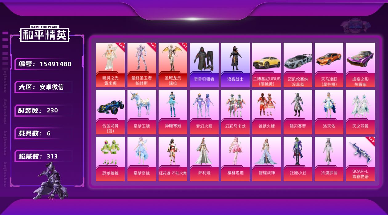 - [12953386]素材身法号/无敌战神框1【特价急出/详情看图】:苹果 微信-无敌战神框-11粉装-7特效枪-3载具-3粉色飞行器-6.7w热力值-14王牌印记-155套装-174枪皮【热门品类】:粉装-雪国幻梦,粉装-梦幻火箭,套装-胖达圆圆,套装-浪客战士【粉色载具】:兰博基尼Estoque(银翼灰),路特斯ELETRE(花绽灰),玛莎拉蒂Ghibli(粉)【粉色套装】:粉装-天使彩虹糖,粉装-雪国幻梦,粉装-梦幻火箭,粉装-潮汐统领,粉装-黄蜂伯爵,粉装-冰霜白皇,粉装-炙焰红王,粉装-黄伞悠悠,角色-初号机款机体服,粉装-恐龙拽拽,粉装-千面幻镜【粉色枪皮等级】:AKM-梦之光华(六级),SCAR-L-童趣迷兔(七级),SCAR-L-青春物语(一级),M416-五爪金龙(七级),M416-心之恋语(七级),Kar98K-巳巳如意(一级),DP-28-豹影疾电(一级)【粉色飞行器】:梦幻火箭飞行器,庄周梦蝶飞行器,千面幻镜飞行器