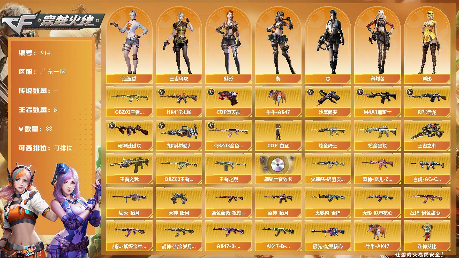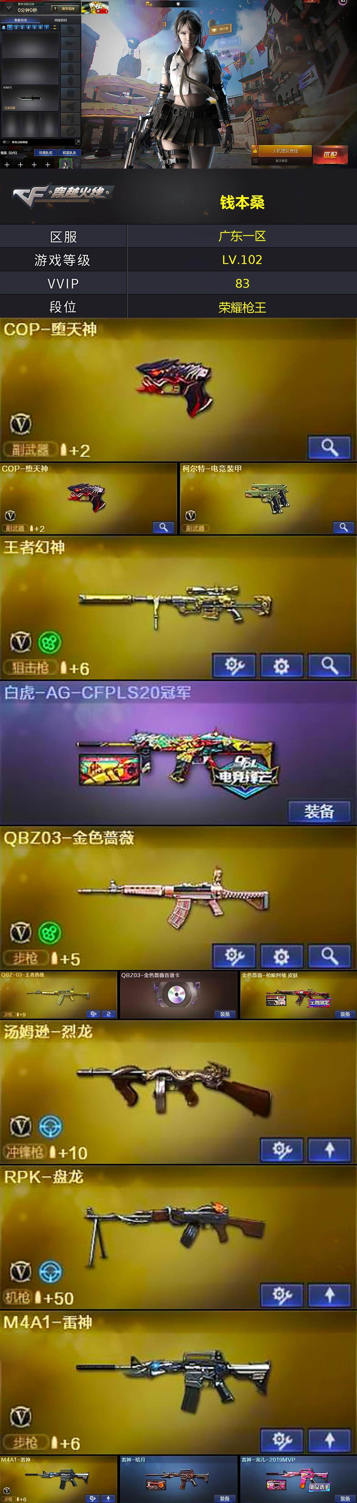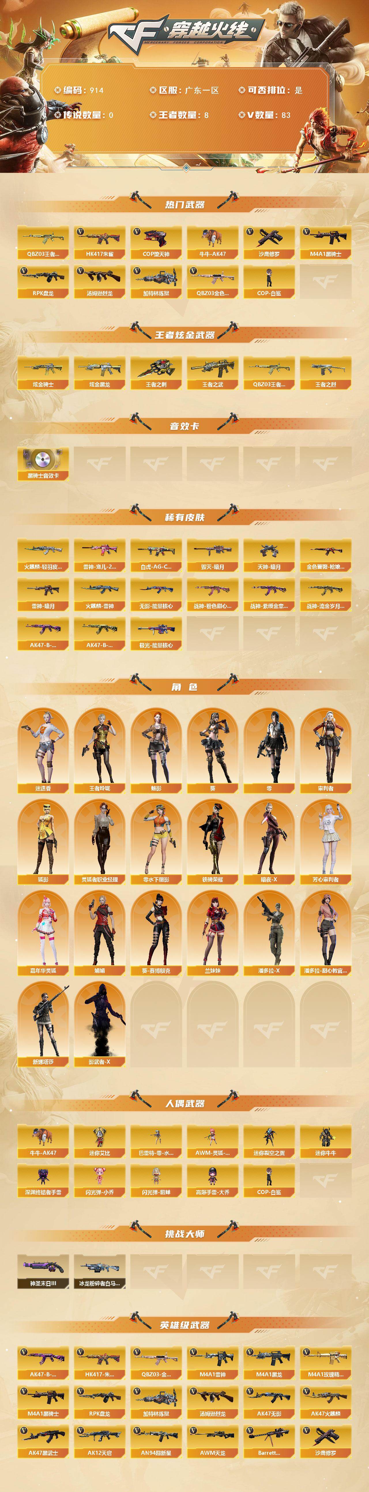 [15675041]广东一区-83V-8王者-2炫金 【热门武器】:QBZ03-金色蔷薇,HK417-朱雀,QBZ-03-王者蔷薇,牛牛-AK47,M4A1-黑骑士,汤姆逊-烈龙,RPK-盘龙,加特林-炼狱*2,COP-白鲨,COP-堕天神*2,沙鹰-修罗*5 【王者炫金武器】:王者之武,王者之烈,QBZ-03-王者蔷薇,王者之刺,炫金骑士,炫金黑龙 【音效卡】:M4A1-黑骑士音效卡 【皮肤】:白虎-AG-CFPLS20冠军,金色蔷薇-枪娘阿敏 皮肤,雷神-暗月,雷神-宠儿-2019MVP,火麒麟-雷神,火麒麟-轻羽皮肤,毁灭-暗月,无影-能量核心,战神-粉色甜心皮肤,战神-紫绶金章皮肤,战神-流金岁月皮肤,AK47-B-常胜将军-曹操,AK47-B-常胜将军-孙权,极光-能量核心,天神-暗月*2 【角色】:零,葵,魅影,迷迭香,审判者,王者玲珑,狐影,暗夜-X,芳心审判者,嘉年华灵狐,娟娟,葵-赛博朋克,兰妹妹,零-水下丽影,灵狐者-职业经理,潘多拉-X,潘多拉-甜心教官,铁骑荣耀,新娜塔莎,影武者-X 【人偶武器】:COP-白鲨,巴雷特-零-水下丽影,AWM-灵狐-15周年嘉年华,牛牛-AK47,迷你裂空之翼,迷你牛牛,深渊终结者手雷,闪光弹-小乔,闪光弹-貂蝉,高爆手雷-大乔,迷你艾比 【挑战大师】:冰龙粉碎者-白马银枪,神圣爆裂者-末日III 【英雄级武器】:M4A1-千变,AK47-火麒麟*2,M4A1-黑龙,M4A1-雷神*2,M4A1-黑骑士,AK47-无影,AK47-黑武士,AK12-天启,AN94-超新星,M4A1-堕天神,HK417-朱雀,M4A1-玫瑰精灵,QBZ03-金色蔷薇,AK-47-猩红传说,AK47-B-战神,AK47-B-常胜将军,黑武士-CF网剧冠军,AWM-天龙,Barrett-毁灭,王者幻神-觉醒版,RPK-盘龙,加特林-炼狱*2,汤姆逊-烈龙,沙鹰-修罗*5,COP-堕天神*2,柯尔特-电竞装甲,天神-CF网剧冠军,屠龙*3,龙啸*2,麒麟刺-堕天神,擎天,麒麟刺,擎天-竞技荣光,尼泊尔-电竞装甲,龙啸-堕天神*4,擎天-CF网剧冠军,王者之击-觉醒版,高爆手雷-堕天神*6,高爆手雷-幻灵,高爆手雷-竞技荣光,闪光弹-堕天神*6,闪光弹-幻灵,闪光弹-雷霆王者-觉醒版,烟雾弹-堕天神*6 【道具】:EP战队炫彩背包,KZ战队炫彩背包,战舰背