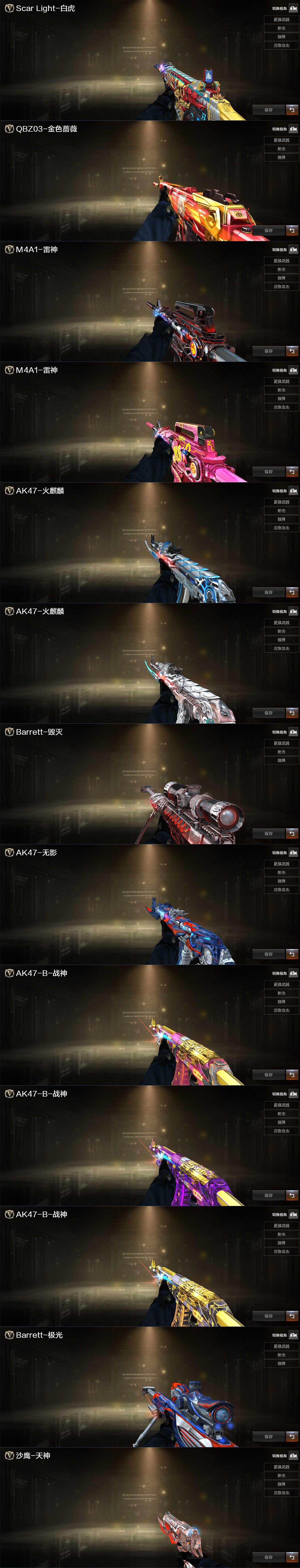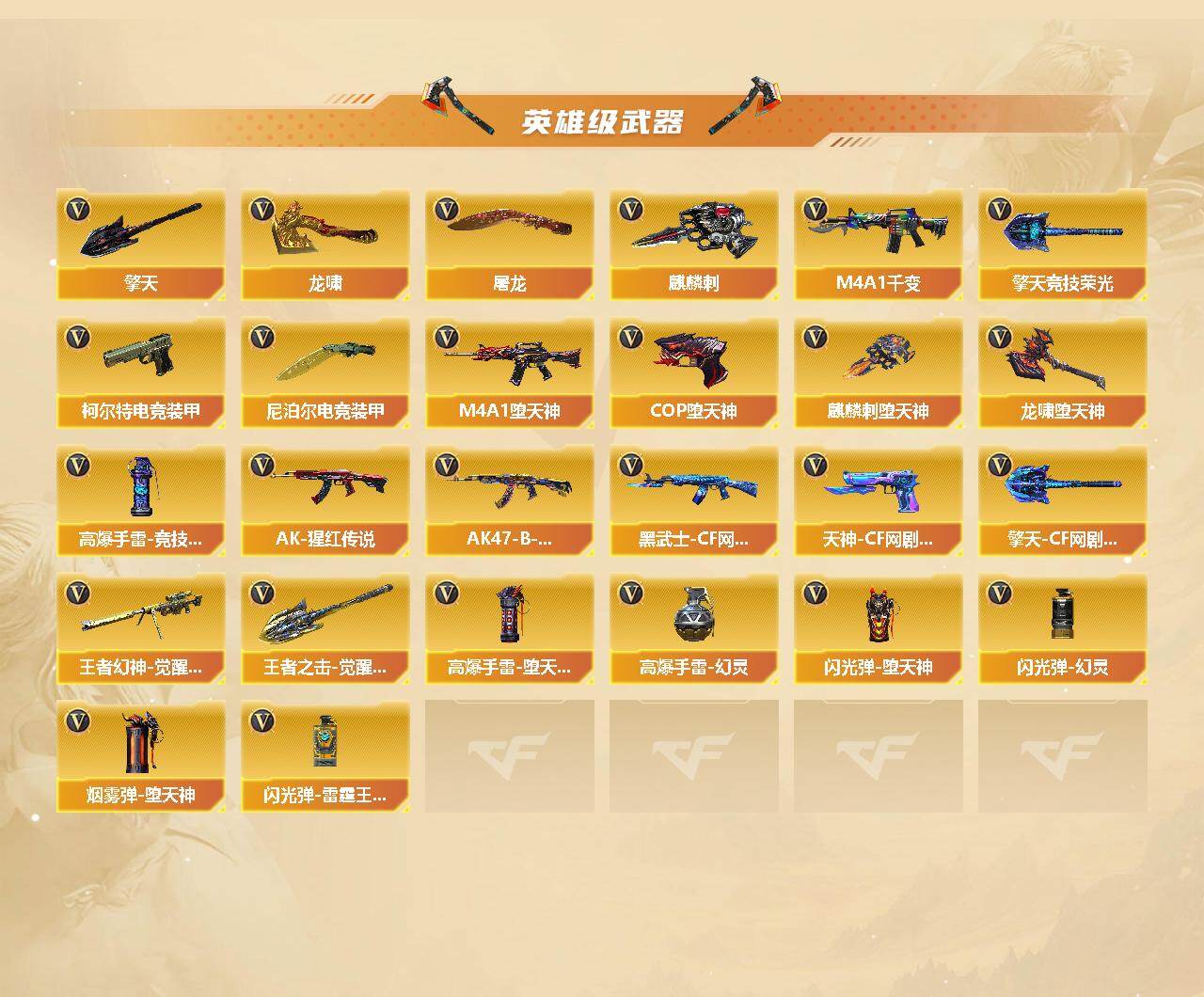 【英雄级武器】:M4A1-千变,AK47-火麒麟*2,M4A1-黑龙,M4A1-雷神*2,M4A1-黑骑士,AK47-无影,AK47-黑武士,AK12-天启,AN94-超新星,M4A1-堕天神,HK417-朱雀,M4A1-玫瑰精灵,QBZ03-金色蔷薇,AK-47-猩红传说,AK47-B-战神,AK47-B-常胜将军,黑武士-CF网剧冠军,AWM-天龙,Barrett-毁灭,王者幻神-觉醒版,RPK-盘龙,加特林-炼狱*2,汤姆逊-烈龙,沙鹰-修罗*5,COP-堕天神*2,柯尔特-电竞装甲,天神-CF网剧冠军,屠龙*3,龙啸*2,麒麟刺-堕天神,擎天,麒麟刺,擎天-竞技荣光,尼泊尔-电竞装甲,龙啸-堕天神*4,擎天-CF网剧冠军,王者之击-觉醒版,高爆手雷-堕天神*6,高爆手雷-幻灵,高爆手雷-竞技荣光,闪光弹-堕天神*6,闪光弹-幻灵,闪光弹-雷霆王者-觉醒版,烟雾弹-堕天神*6