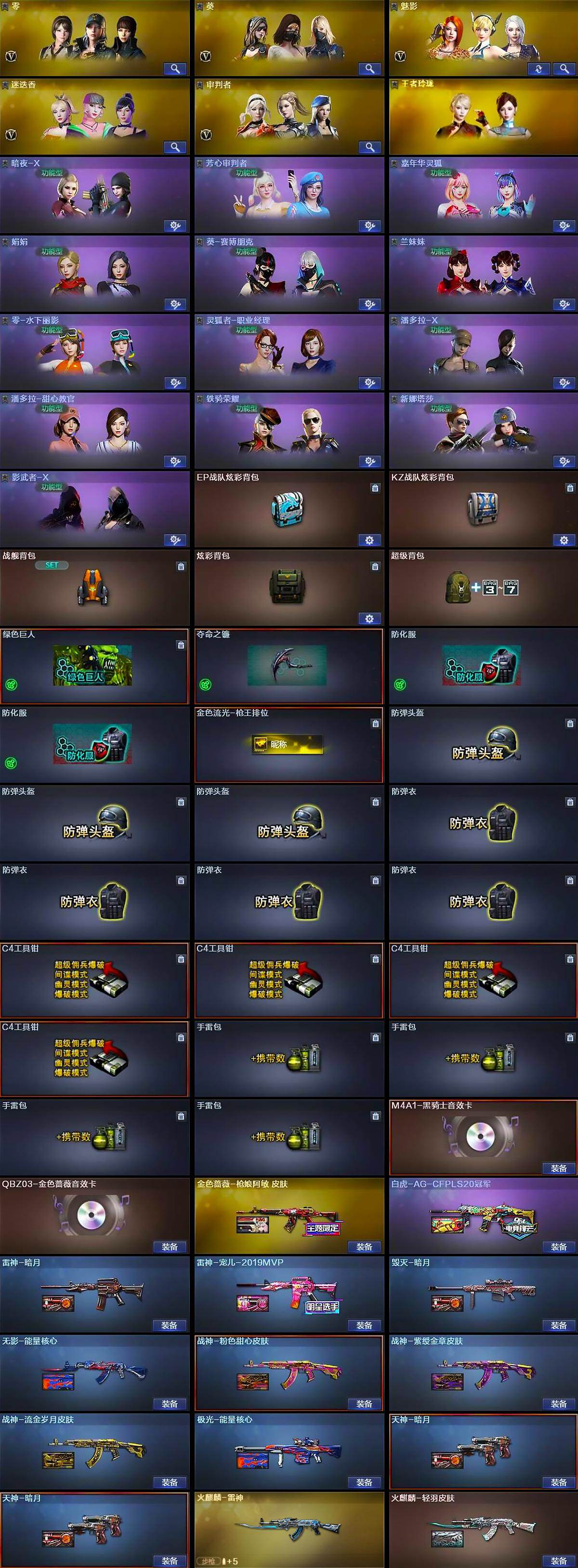 【皮肤】:白虎-AG-CFPLS20冠军,金色蔷薇-枪娘阿敏 皮肤,雷神-暗月,雷神-宠儿-2019MVP,火麒麟-雷神,火麒麟-轻羽皮肤,毁灭-暗月,无影-能量核心,战神-粉色甜心皮肤,战神-紫绶金章皮肤,战神-流金岁月皮肤,AK47-B-常胜将军-曹操,AK47-B-常胜将军-孙权,极光-能量核心,天神-暗月*2