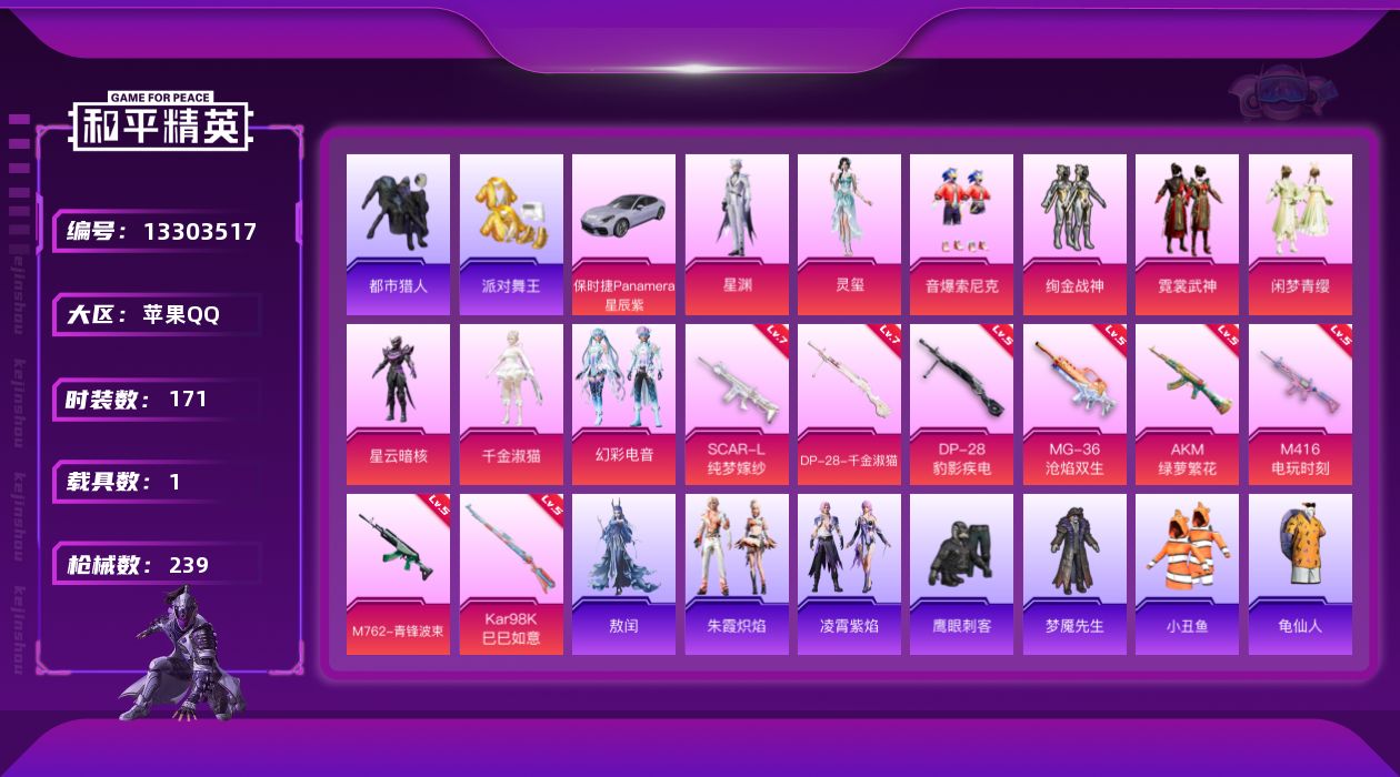 [13303517]【1519】苹果 手Q-9粉装-8特效枪-1载具-3粉色飞行器-77974热力值-18王牌印记-171套装-239枪皮 【热门品类】:粉装-音爆索尼克,套装-都市猎人,套装-派对舞王,套装-小丑鱼,套装-龟仙人,套装-粉红小猪 【粉色载具】:保时捷Panamera(星辰紫) 【粉色套装】:粉装-绚金战神,粉装-霓裳武神,粉装-音爆索尼克,粉装-闲梦青缨,角色-星云暗核,角色-千金淑猫,粉装-幻彩电音,角色-星渊,角色-灵玺 【粉色枪皮等级】:AKM-绿萝繁花(五级),SCAR-L-纯梦嫁纱(七级),M416-电玩时刻(五级),M762-青锋波束(五级),Kar98K-巳巳如意(五级),DP-28-千金淑猫(七级),DP-28-豹影疾电(五级),MG-36-沧焰双生(五级) 【粉色枪皮】:AKM-绿萝繁花,SCAR-L-纯梦嫁纱,M416-电玩时刻,M762-青锋波束,Kar98K-巳巳如意,DP-28-千金淑猫,DP-28-豹影疾电,MG-36-沧焰双生 【粉色飞行器】:星夜魔法师飞行翼,歌者泠鸢飞行器,无垠阁飞行器 【粉色降落伞】:海渊国主降落伞,筑梦精灵降落伞,彩虹甜喵降落伞,青空秋雨降落伞,歌者泠鸢降落伞,暗夜鎏金降落伞,飒粉甜心降落伞,天星战神降落伞,未来歌姬降落伞,闲梦青缨降落伞,圣堂之誓降落伞,江南烟雨降落伞,创世·救赎降落伞,未来领航者降落伞,幽焰骑士降落伞,千金淑猫降落伞,智耀战神降落伞,无垠阁降落伞 【稀有套装】:套装-龟仙人,套装-巳巳如意,套装-雏菊兔兔,套装-萝兰蝴蝶,套装-小熊娃娃,角色-多纳泰罗,套装-糖糖葫芦,套装-青团波波,套装-棉花软糖,角色-都市丽猫,角色-摩登魅猫,角色-怀庆长公主,套装-燕燕于飞,套装-鱼渊荷华,套装-粉恋花,套装-紫幽梦,套装-蓝冰羽,角色-猎影月神,角色-绛羽幽主,套装-朱霞炽焰,套装-凌霄紫焰,角色-敖闰 【稀有枪皮】:AKM-彩虹符号,AKM-影袭,AKM-星之彼岸,AKM-灼热熔岩,AKM-破晓战魂,AKM-筑梦精灵,AKM-虎虎生威,AKM-霓虹街区,AKM-龙的传人,M16A4-幻世战舞者,M16A4-甜心亚梦,M16A4-莲影清波,M16A4-千金淑猫,SCAR-L-玉兔迎春,SCAR-L-红色方程式,SCAR-L-黄金龙骨,M416-糯团青竹,M416-红色方程式,M416-绯红前夜,M41
