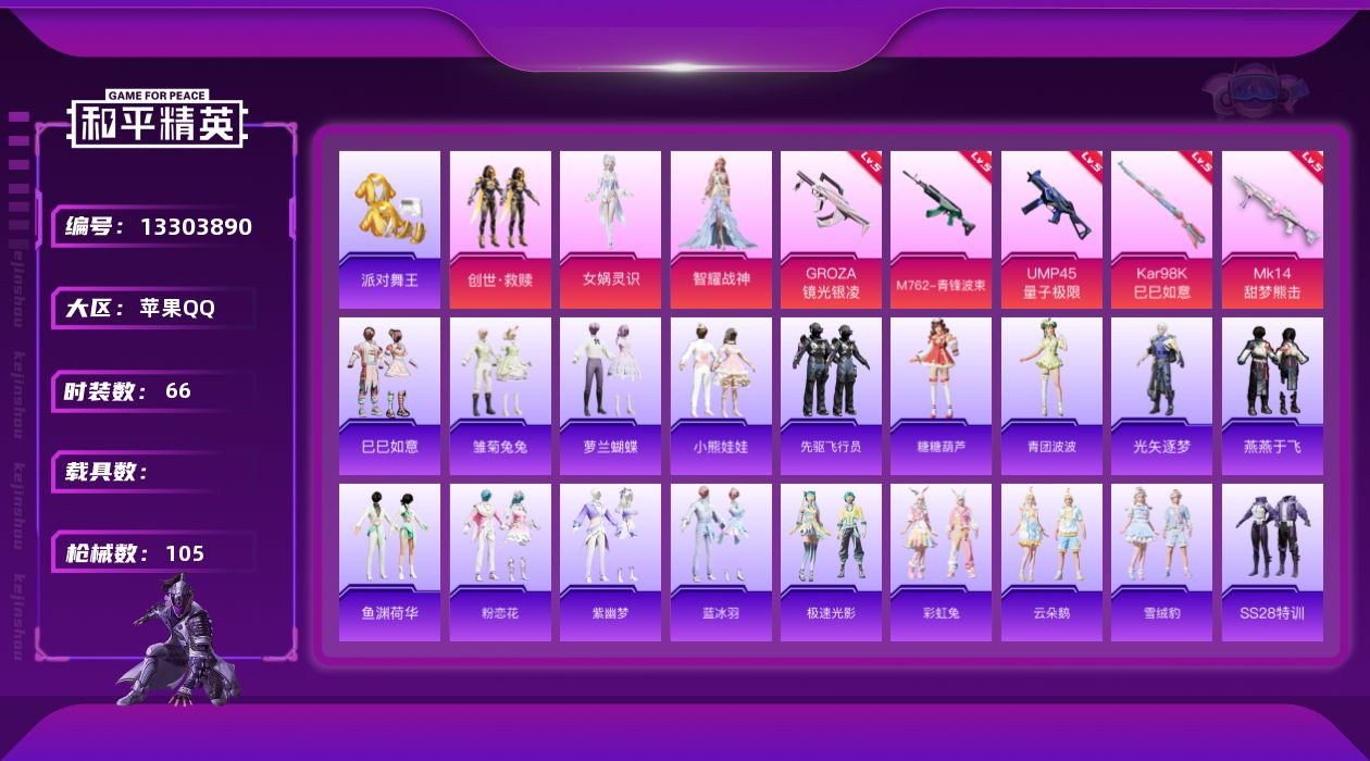 - PX_2111803- 苹果手Q-2王牌印记-4粉装-5特效枪-0载具-33089热力值-74套装-98枪皮-1卓越印记-0传奇印记 【4粉装】,冷漠罗丽,紫电风暴,炙焰牛王,绮梦青鸾 【5特效枪】SCAR-L-甜梦小狐-6级 GROZA-镜光银凌-5级 AUG-暖羊咩咩-5级 Kar98K-巳巳如意-5级 M24-暗星紫秘-5级 【2稀有紫装】,小丑鱼,龟仙人, 【74稀有时装】,SS31特训