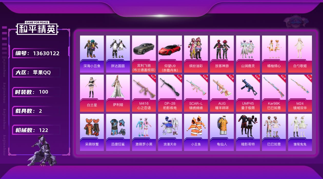 [13630122]【1541】苹果 手Q-7粉装-7特效枪-2载具-2粉色飞行器-42665热力值-8王牌印记-100套装-122枪皮