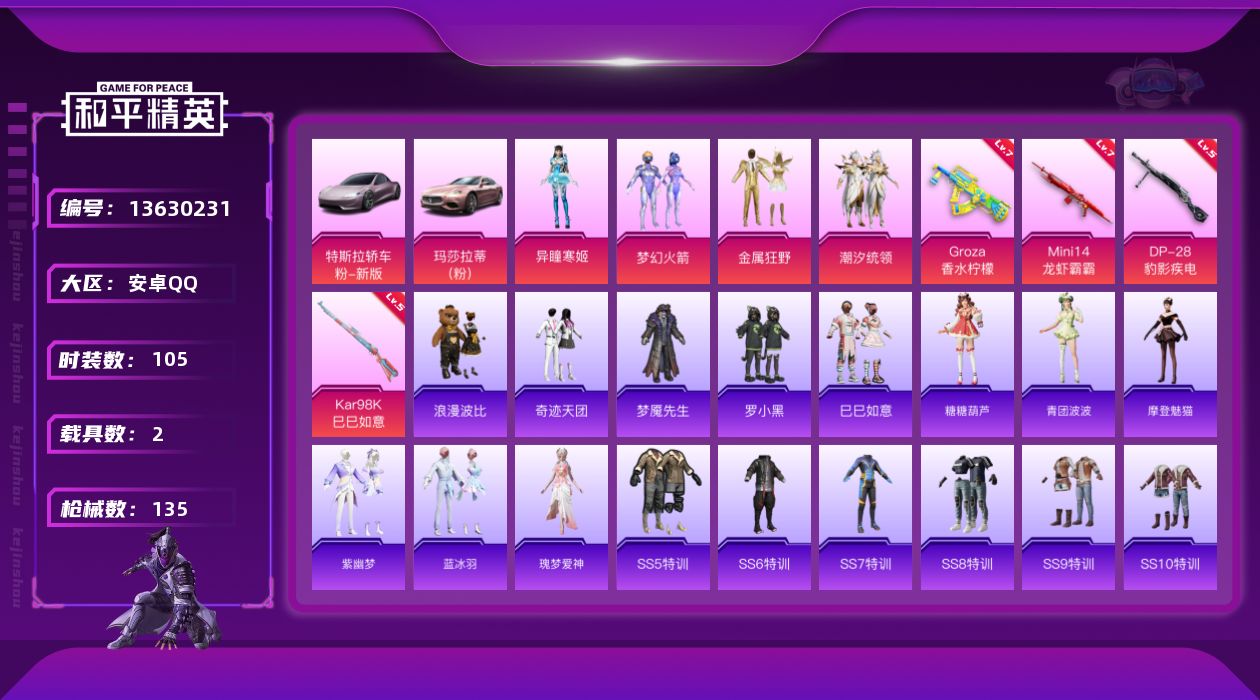 - [12044885]【特价急出/详情看图】:安卓 手Q-2粉装-1特效枪-1载具-1粉色飞行器-1.4w热力值-1王牌印记-37套装-46枪皮【粉色载具】:兰博基尼URUS(明艳黄)【粉色套装】:粉装-冰霜白皇,粉装-炙焰红王【粉色枪皮等级】:Kar98K-巳巳如意(四级)【粉色飞行器】:齐天大圣飞行器
