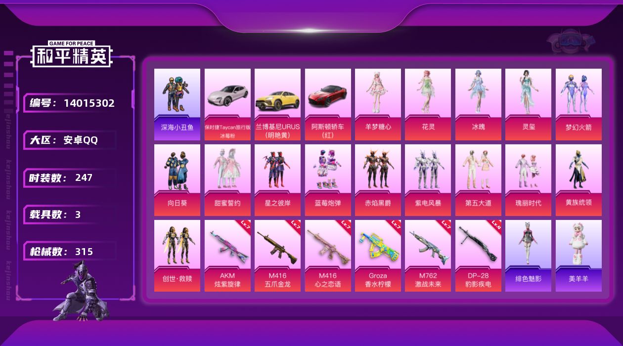[14015302]【1578】安卓 手Q-15粉装-6特效枪-3载具-2粉色飞行器-110444热力值-19王牌印记-247套装-315枪皮