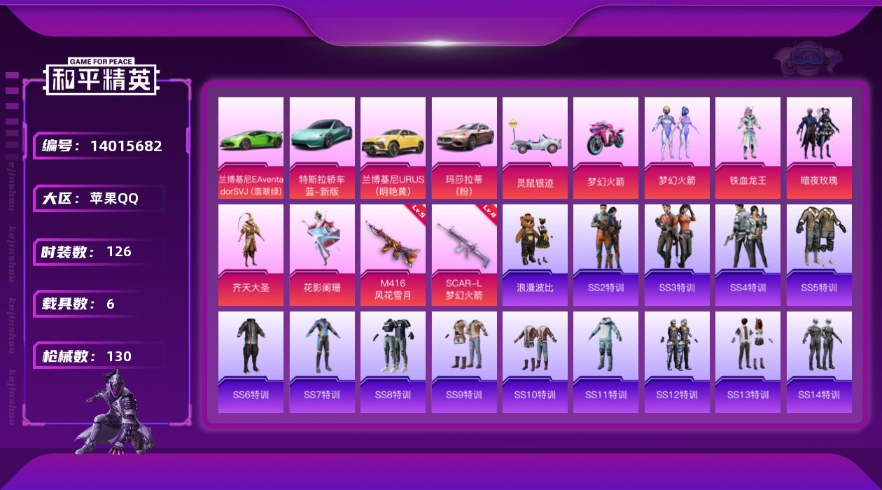 [14015682]【1579】苹果 手Q-5粉装-2特效枪-6载具-3粉色飞行器-48922热力值-5王牌印记-126套装-130枪皮 【热门品类】:粉装-梦幻火箭,套装-SS1特训,套装-浪漫波比,小恶魔头饰 【粉色载具】:特斯拉Roadster(水滴蓝),兰博基尼Aventador SVJ(翡翠绿),兰博基尼URUS(明艳黄),玛莎拉蒂Ghibli(粉),灵鼠银迹,双人摩托-梦幻火箭 【粉色套装】:粉装-梦幻火箭,粉装-铁血龙王,粉装-暗夜玫瑰,粉装-齐天大圣,粉装-花影阑珊 【粉色枪皮等级】:SCAR-L-梦幻火箭(四级),M416-风花雪月(五级) 【粉色枪皮】:SCAR-L-梦幻火箭,M416-风花雪月 【粉色飞行器】:梦幻火箭飞行器,阿狸红飞行器,齐天大圣飞行器 【粉色降落伞】:至尊龙雀降落伞,梦幻火箭降落伞,古堡领主降落伞,林间仙鹿降落伞,齐天大圣降落伞,洛神天依降落伞,沙丘之主降落伞,墨龙九天降落伞 【稀有枪皮】:AKM-冰凉西瓜,AKM-夜灯,AKM-彩虹符号,AKM-生命誓言,AKM-破晓战魂,AKM-虎虎生威,AKM-阿狸红,AKM-霓虹街区,M16A4-夜灯,M16A4-机械英豪,M16A4-生命誓言,M16A4-红色方程式,M16A4-蓝色火焰,SCAR-L-暗夜玫瑰,SCAR-L-生命誓言,SCAR-L-繁花小夜曲,SCAR-L-红色方程式,SCAR-L-龙宫之主,M416-夜灯,M416-滑板小狐,M416-红色方程式,M416-绯红前夜,M416-蓝色火焰,GROZA-彩虹符号,GROZA-治愈之星,GROZA-生命誓言,GROZA-黑色刀锋,AUG-耀粉歌者,QBZ-彩虹符号,QBZ-洛神天依,M762-拳皇97,M762-瑞龙福将,M762-绯红前夜,M762-魅夜紫皇,Mk47-洛神天依,G36C-荒野猎神,Famas-墨龙九天,UZI-炫彩节奏,UZI-生命誓言,UMP45-夜灯,UMP45-诡娃娃,Vector-夜灯,Vector-彩虹符号,Vector-治愈之星,Vector-生命誓言,Vector-风花雪月,Vector-黑色刀锋,汤姆逊-林间仙鹿,汤姆逊-耀粉歌者,汤姆逊-银刃赛罗,野牛-机械英豪,野牛-王牌四分卫,Kar98K-彩虹符号,Kar98K-梦幻火箭,Kar98K-洛神天依,Kar98K-王子的夏天,M24-治愈之星,M2