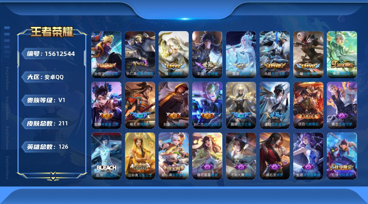 - [13038946]安卓Q-V6-最强王者段位-123英雄-148皮肤-1典藏-0珍品无双-1无双-1珍品传说-6传说-33史诗 【英雄全皮】:孙权全皮,影全皮 【荣耀典藏】:韩信弑枪猎影 【无双皮肤】:李白碎月剑心 【珍品传说】:暃朽木白哉 【传说皮肤】:司空震愿照山河定,澜愿照九州拓,桑启鸣野蒿,赵云乘龙铭钟鼎,达摩黄金狮子座,宫本武藏地狱之眼 【限定皮肤】:蒙犽顽岩魄,姜子牙天穹之誓,杨戬破阵退雄兵,狄仁杰阴阳师,赵云皇家上将,高渐离玩趣恶龙,狄仁杰魔术师,狄仁杰万华元夜,项羽海滩派对,李元芳云中旅人,雅典娜黎明之约,百里玄策原初追逐者,沈梦溪大漠名商,裴擒虎李小龙,鲁班大师探海日志,桑启海盐诗旅,张良古海寻踪,鬼谷子天穹祈灯,李白碎月剑心,赵云乘龙铭钟鼎,沈梦溪龙舞盛年,鲁班七号蔬乡物语,李元芳蔬乡物语,刘邦剑破天穹,程咬金群星魔术团,刘备异域游侠,芈月浮光幕影,周瑜熔金海岸 【年限皮肤】:赵云乘龙铭钟鼎 【赛季限定】:狄仁杰万华元夜,张良古海寻踪,李元芳云中旅人,雅典娜黎明之约,百里玄策原初追逐者,沈梦溪大漠名商,鲁班大师探海日志,桑启海盐诗旅,鬼谷子天穹祈灯,刘邦剑破天穹,姜子牙天穹之誓 【战令限定】:鲁班七号蔬乡物语,李元芳蔬乡物语 【史诗皮肤】:赵云皇家上将,赵云未来纪元,王昭君偶像歌手,狄仁杰魔术师,宫本武藏鬼剑武藏,孙尚香水果甜心,妲己魅力维加斯,妲己女仆咖啡,曹操幽灵船长,李白千年之狐,花木兰水晶猎龙者,刘邦德古拉伯爵,夏侯惇乘风破浪,诸葛亮黄金分割率,亚瑟心灵战警,安琪拉心灵骇客,百里守约特工魅影,李元芳逐浪之夏,程咬金功夫厨神,白起星夜王子,大乔猫狗日记,狄仁杰鹰眼统帅,百里玄策原初追逐者,裴擒虎李小龙,雅典娜黎明之约,哪吒雪上飞焰,鲁班七号蔬乡物语,芈月浮光幕影,蒙犽顽岩魄,牛魔星界战将,孙膑茶境仙,狂铁龙之律动 【其他皮肤】:项羽海滩派对,韩信教廷特使,韩信街头霸王,露娜哥特玫瑰,赵云忍炎影,芈月红桃皇后,白起白色死神,扁鹊救世之瞳,宫本武藏未来纪元,安琪拉玩偶对对碰,妲己少女阿狸,典韦黄金武士,亚瑟死亡骑士,达摩拳王,花木兰兔女郎,甄姬花好人间,刘备万事如意,宫本武藏万象初新,后羿阿尔法小队,狄仁杰阴阳师,刘备纽约教父,刘备汉昭烈帝,关羽龙腾万里,狂铁命运角斗场,老夫子功夫老勺,诸葛亮掌控之力,鬼谷子幻乐之宴,大乔守护之力,高渐离玩趣恶龙,哪吒次元突破