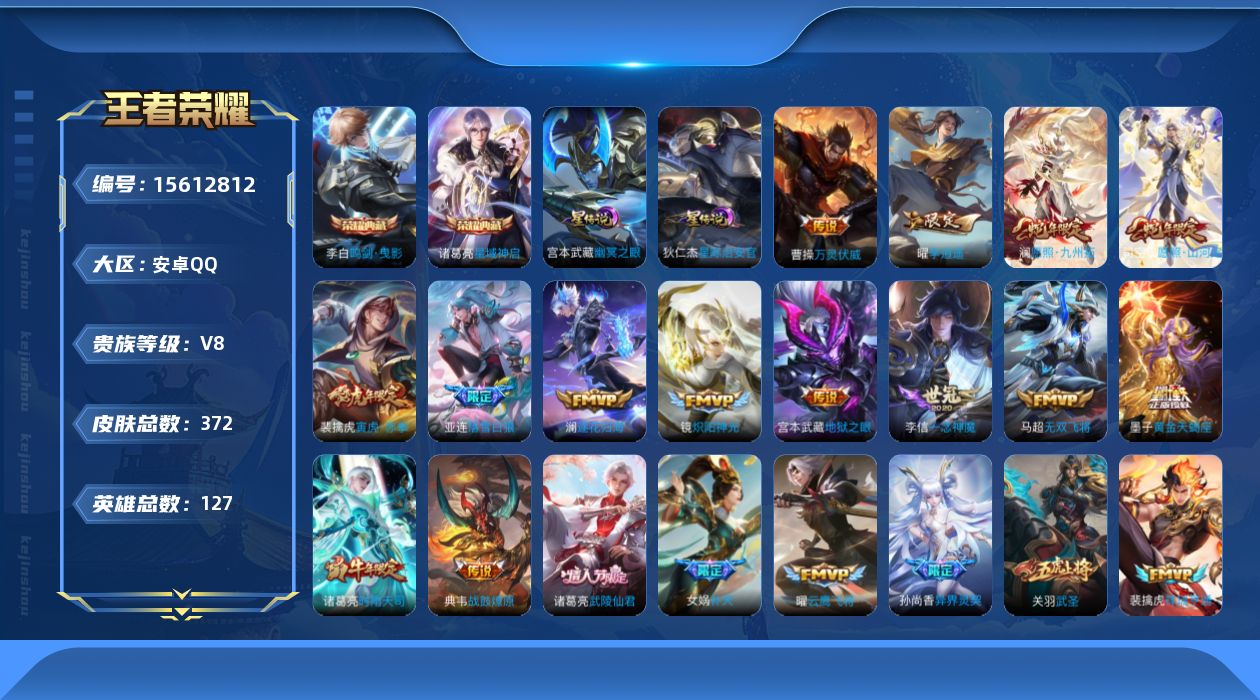 [15612812]【店主推荐捡漏号!可直接换绑】安卓Q-V8-至尊星耀III段位-127英雄-372皮肤-2典藏皮肤-32传说-101史诗-2星元 【英雄全皮】:鬼谷子全皮,蒙恬全皮,戈娅全皮,空空儿全皮,影全皮 【荣耀典藏】:李白鸣剑曳影,诸葛亮星域神启 【传说皮肤】:曹操万灵伏威,司空震愿照山河定,澜愿照九州拓,云缨幻光神枪,裴擒虎祥瑞亨通,桑启鸣野蒿,墨子黄金天蝎座,亚连落雪白狼,典韦战鼓燎原,澜逐花归海,干将莫邪画中仙,虞姬无限倾心,李白诗剑行,马超无双飞将,女娲补天,裴擒虎寅虎赤拳,鲁班七号寅虎瑞焰,孙尚香异界灵契,曜李逍遥 ,周瑜音你心动,诸葛亮时雨天司,铠绛天战甲,镜炽阳神光,虞姬启明星使,关羽武圣,曜云鹰飞将,李信一念神魔,貂蝉猫影幻舞,后羿黄金射手座,诸葛亮武陵仙君,宫本武藏地狱之眼,狄仁杰超时空战士 【限定皮肤】:大乔绒语心约,姜子牙天穹之誓,杨戬破阵退雄兵,李白谪仙醉月,狄仁杰阴阳师,赵云皇家上将,赵云引擎之心,墨子神迹守卫,孙尚香异界灵契,鲁班七号乒乒小将,鲁班七号寅虎瑞焰,庄周高山流水,扁鹊奇幻香踪,白起夜都怪侠,芈月幻夜卜梦,元歌云间偶戏,元歌无心,夏侯惇朔风刀,甄姬游园惊梦,马可波罗山海玄木吟,狄仁杰魔术师,狄仁杰万华元夜,达摩沙漠行僧,项羽海滩派对,老夫子醍醐杖,老夫子航海奇遇记,关羽武圣,程咬金演武夺筹,韩信飞衡,韩信傲雪梅枪,王昭君午后时光,兰陵王金庭之子,花木兰青春决赛季,孙悟空至尊宝,孙悟空孙行者,后羿如梦令,后羿圣弓游侠,李元芳云中旅人,虞姬启明星使,虞姬无限倾心,钟馗驱傩正仪,杨玉环遇见飞天,杨戬潮玩骑兵,女娲朔望之晖,女娲补天,干将莫邪真爱魔法,干将莫邪画中仙,雅典娜黎明之约,鬼谷子原初探秘者,鬼谷子五谷丰年,诸葛亮武陵仙君,诸葛亮时雨天司,黄忠火炮绅士,苏烈千军破阵,百里玄策原初追逐者,百里守约朱雀志,弈星混沌棋,梦奇顽趣,沈梦溪星空之诺,沈梦溪大漠名商,明世隐疑决卦,明世隐吟游魔法,裴擒虎李小龙,裴擒虎寅虎赤拳,裴擒虎擒涛扼浪,狂铁电玩高手,伽罗天狼溯光者,上官婉儿天狼绘梦者,嫦娥如梦令,嫦娥拒霜思,嫦娥暖冬兔眠,曜李逍遥 ,西施玲珑珍味,鲁班大师探海日志,镜匿光追影者,桑启海盐诗旅,暃星界游侠,戈娅驭风魔法,艾琳女武神,阿古朵江河有灵,张良古海寻踪,蒙恬荣光圣徽,高渐离燃音魔法,妲己灵卜魔法,鬼谷子天穹祈灯,姬小满妄想食味,亚连落