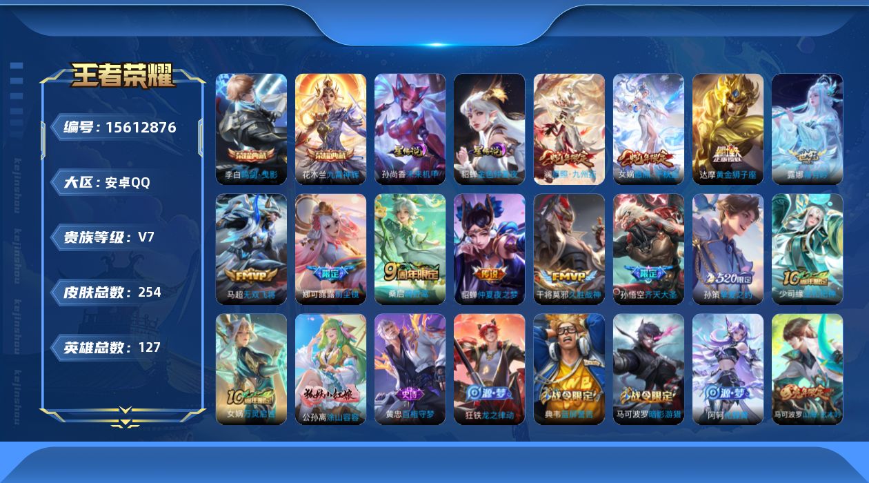 [15612876]【店主推荐捡漏号!可直接换绑】安卓Q-V7-最强王者段位-127英雄-254皮肤-2典藏皮肤-12传说-81史诗-2星元